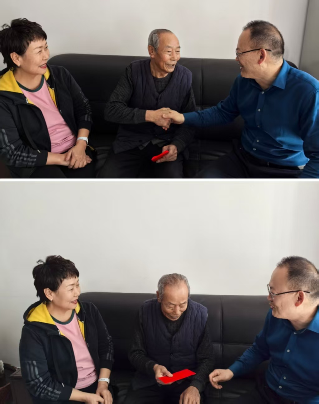 离退休人员工作处通过打电话拜访了解到退休教师照日格图刚做完手术回家养病的消息后,2025年4月7日,楚长利处长和额尔敦其其格副处长带着关怀前往照日格图老师家中进行慰问。