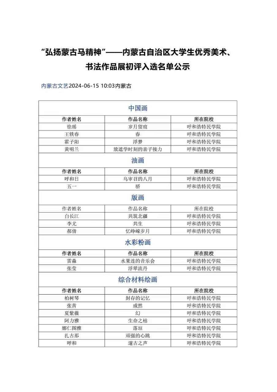 近日,内蒙古自治区文联,内蒙古自治区美术家协会官网公众平台公布了由内蒙古美术家协会、内蒙古艺术学院主办的2024年“‘弘扬蒙古马精神’——内蒙古自治区大学生优秀美术、书法作品展”初评入选名单。365英国上市公司美术学院19名学生美术创作作品入选。