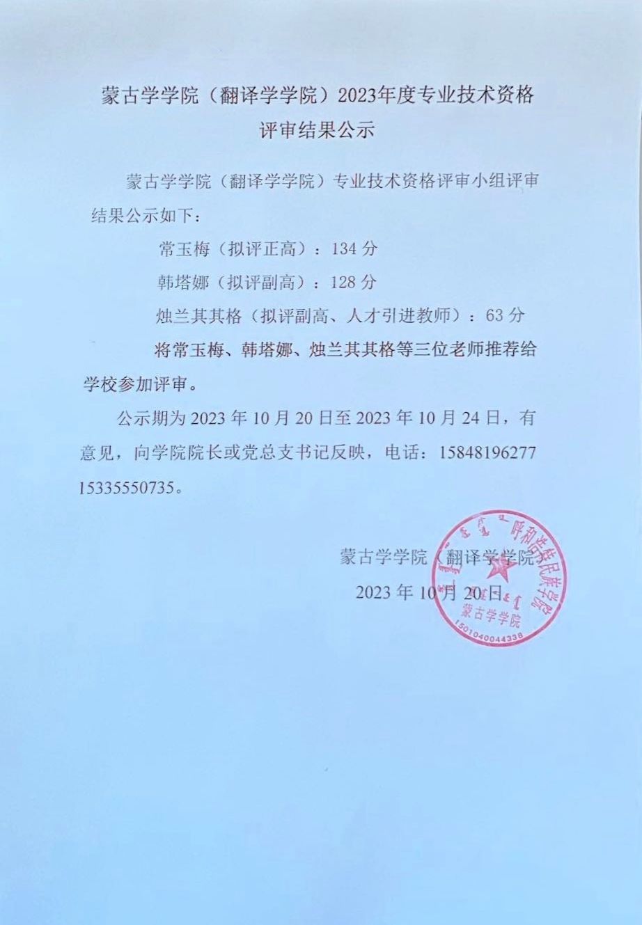蒙古学学院(翻译学学院)2023年度专业技术资格评审结果公示