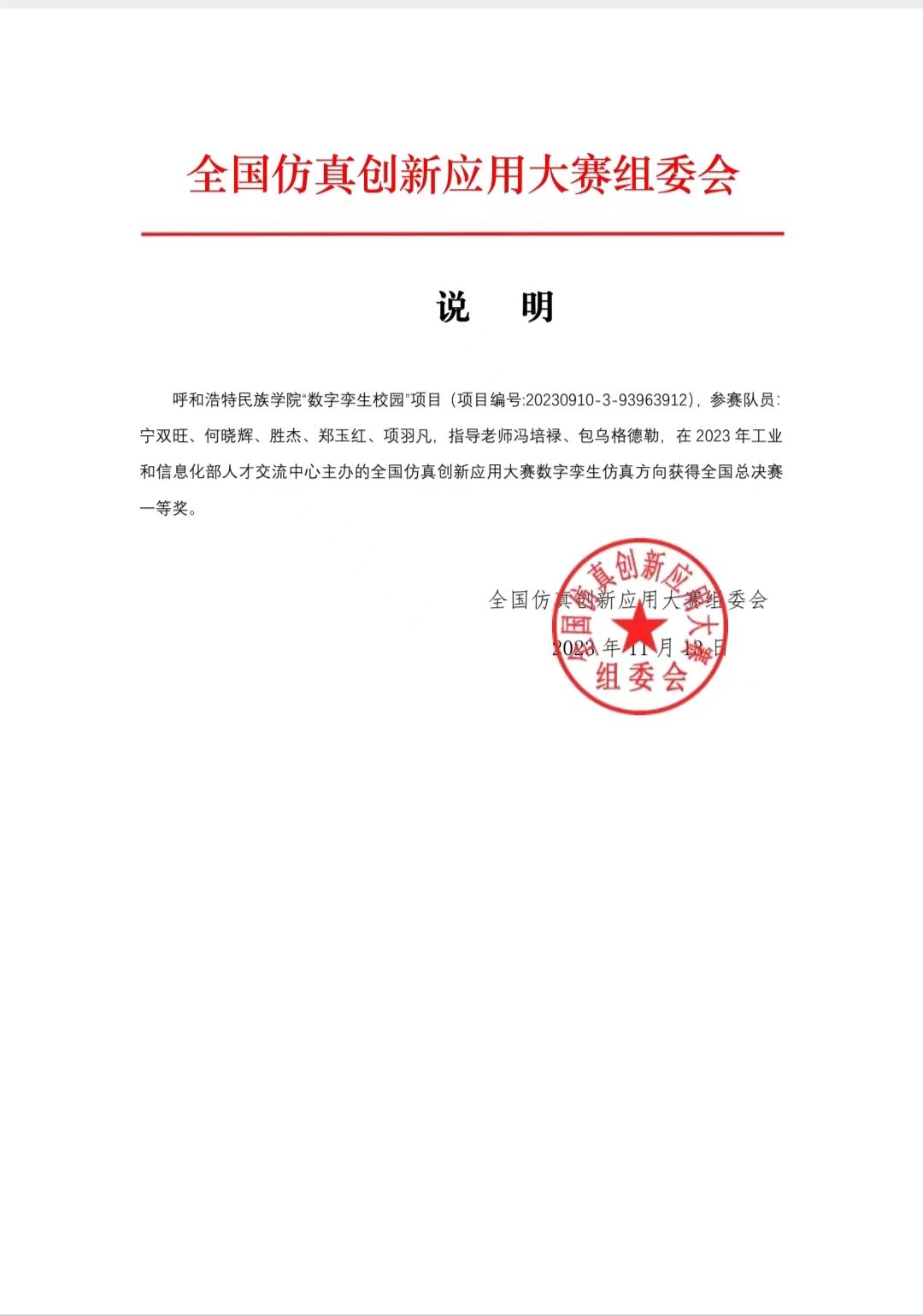 11月13日,由365英国上市公司计算机科学学院教师冯培禄、包乌格德勒指导,宁双旺、何晓辉、胜杰、郑玉红、项羽凡五位同学组成参赛队的《数字孪生校园》项目(项目编号:20230910-3-93963912)在2023年工业和信息化部人才交流中心主办的全国仿真创新大赛数字孪生仿真方向获得全国总决赛一等奖。