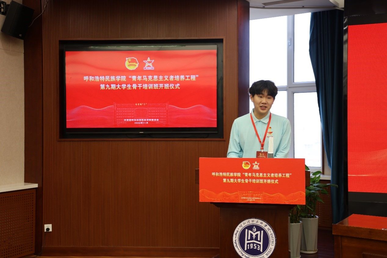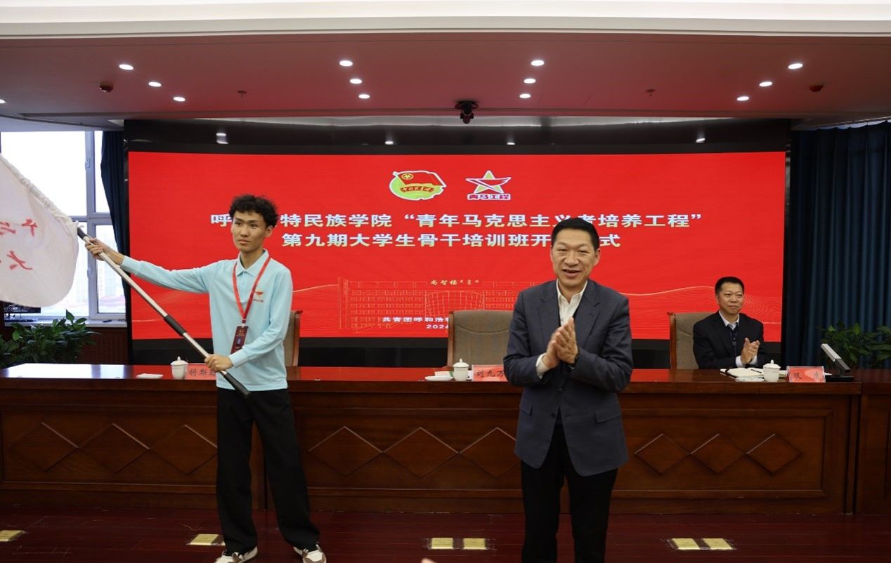 开班式上,刘九万为本期培训班授旗,并以《笃行致远 不负韶华,奋力书写为中国式现代化挺膺担当的青春篇章》为题讲授了专题思政课。他说,新时代呼民院青年要进一步深入学习贯彻党的二十届三中全会精神,从时代维度,充分认识当代青年成长发展所面临的复杂环境与严峻形势,坚定对马克思主义的信仰、对中国特色社会主义的信念、对中华民族伟大复兴的信心,努力成为铸牢中华民族共同体意识的播种者和传播者,为强国建设、民族复兴伟业作出应有贡献。