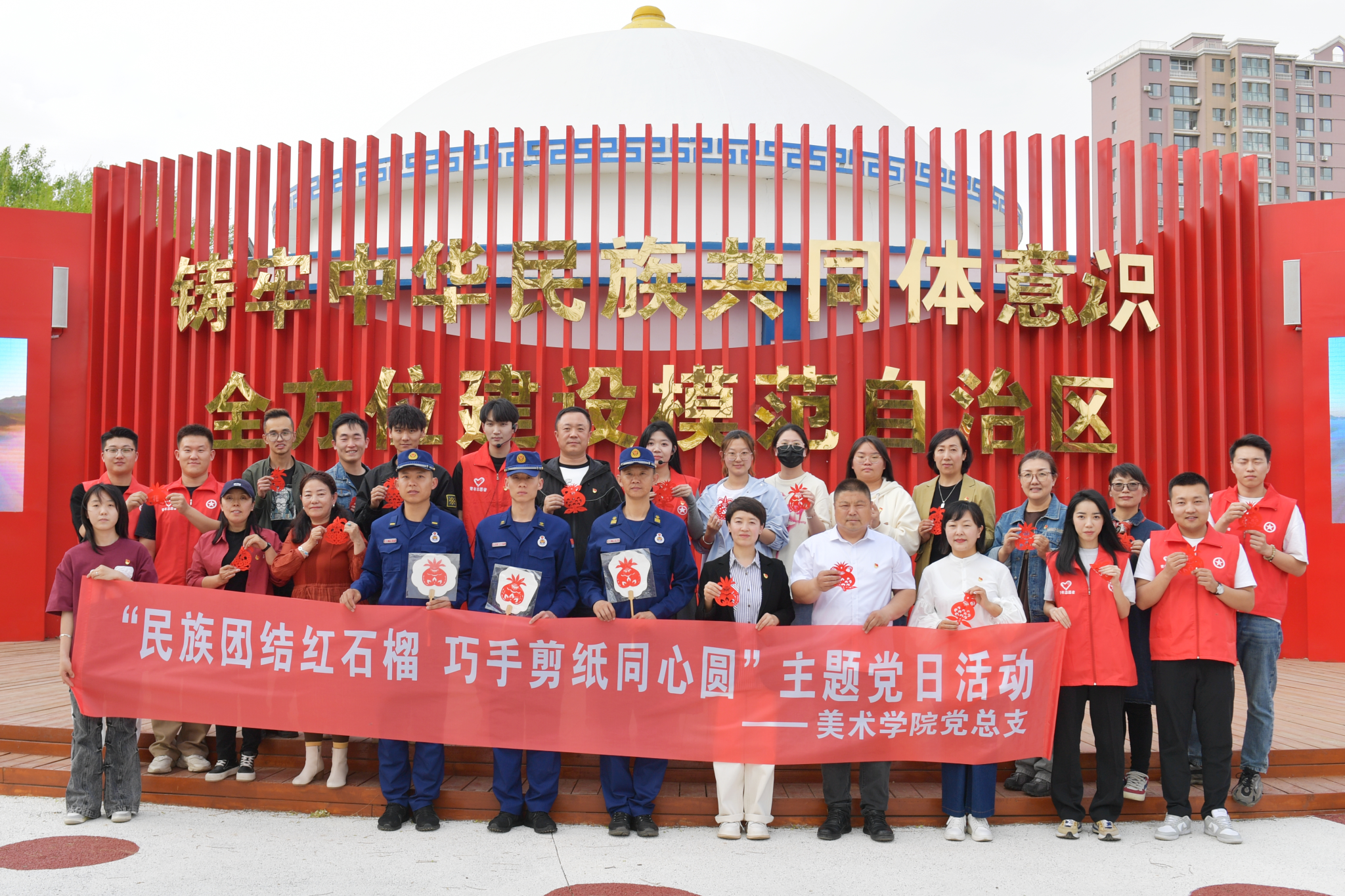 为深入学习贯彻习近平总书记关于加强和改进民族工作的重要思想,结合专业特色深切领会“像石榴籽一样紧紧抱在一起”寄予“民族团结”的深刻寓意,4月25日,美术学院党总支与内蒙古北疆志愿服务联合会、呼市新城区新华东街消防救援站,在回民区“红石榴”志愿服务主题公园联合开展了《民族团结红石榴 巧手剪纸同心圆》主题党日活动。活动由美术学院党总支书记吴利春主持,学院包曙光老师现场指导石榴籽剪纸过程。美术学院师生党员、内蒙古北疆志愿服务联合会党员志愿者和呼市新城区新华东街消防救援站消防员共30余人参加活动。