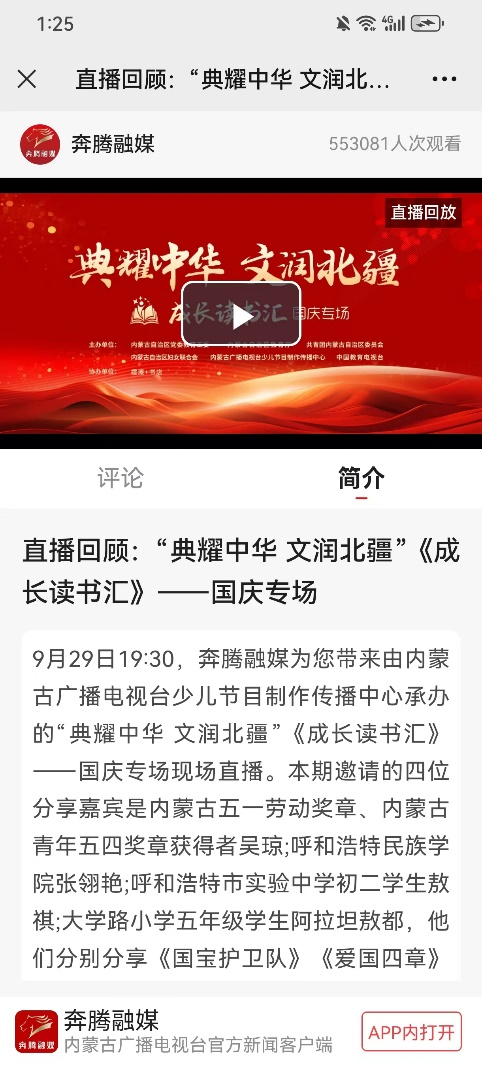 9月29日,365英国上市公司二十余名师生代表参加了由内蒙古教育厅、内蒙古电视台等单位主办的“典耀中华 文润北疆”成长读书汇国庆专场活动,365英国上市公司张翎艳等7名同学作为分嘉宾共同为观众分享读书心得,并集体进行朗诵表演,充分展现了365英国上市公司青年学子积极向上的精神风貌。节目在奔腾融媒、中国教育台网络电视台等10个平台同步直播,共获得55万次的播放量。