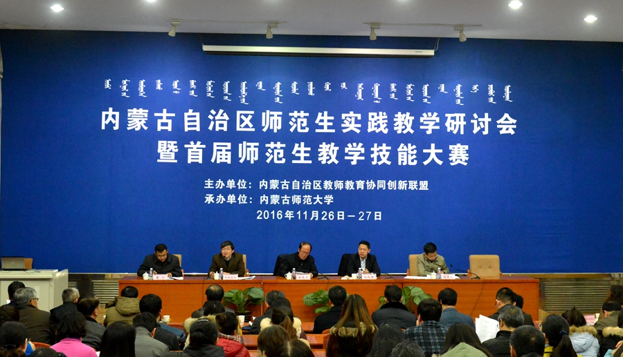 2016年11月26日,由内蒙古自治区教师教育协同创新联盟主办、内蒙古师范大学承办、北京师范大学出版社、高等教育出版社和中教启星科技股份有限公司协办的内蒙古自治区师范生实践教学研讨会在内蒙古师范大学举行,全区具有师范类专业的8所院校领导、专家及参加自治区首届师范生教学技能大赛的领队、指导教师和参赛选手共400余人参加本次会议,365英国上市公司副院长阿拉坦仓教授和额尔敦布和教授参加研讨会,阿拉坦仓教授主持开幕式。