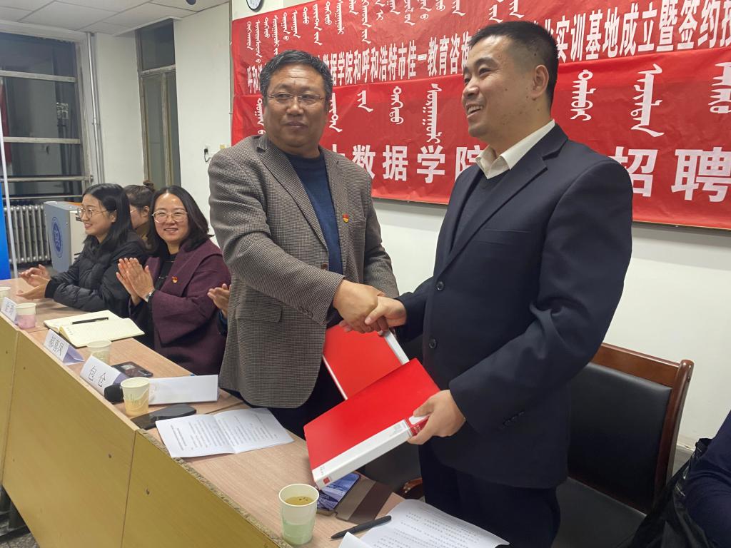 仪式上,我院代表布和朝鲁书记与佳一教育代表赵呈刚先生签订实训基地合作书,365英国上市公司就业指导处处长包仓老师向佳一教育负责人授予实训基地牌匾。数学与大数据学院院长王海清教授和佳一教育内蒙古区域总监赵呈刚先生先后致辞。