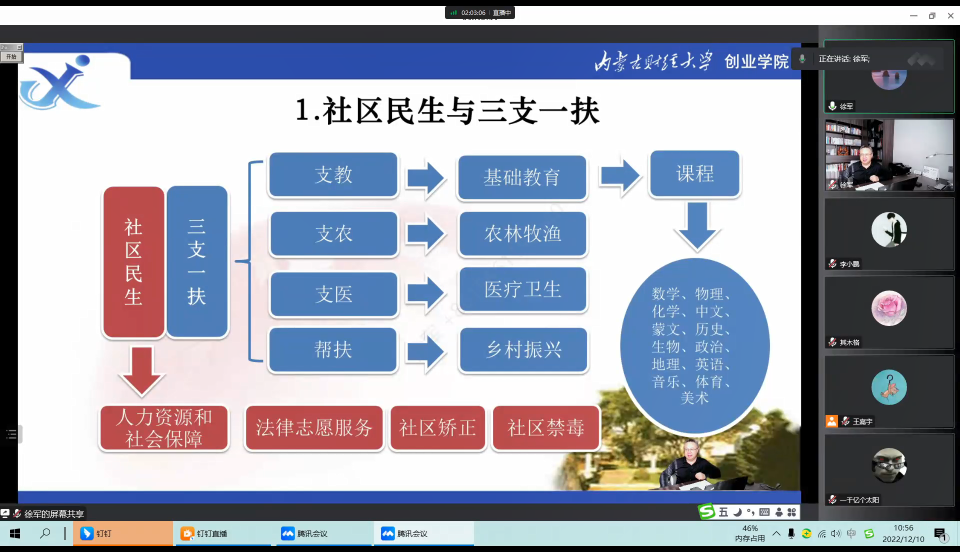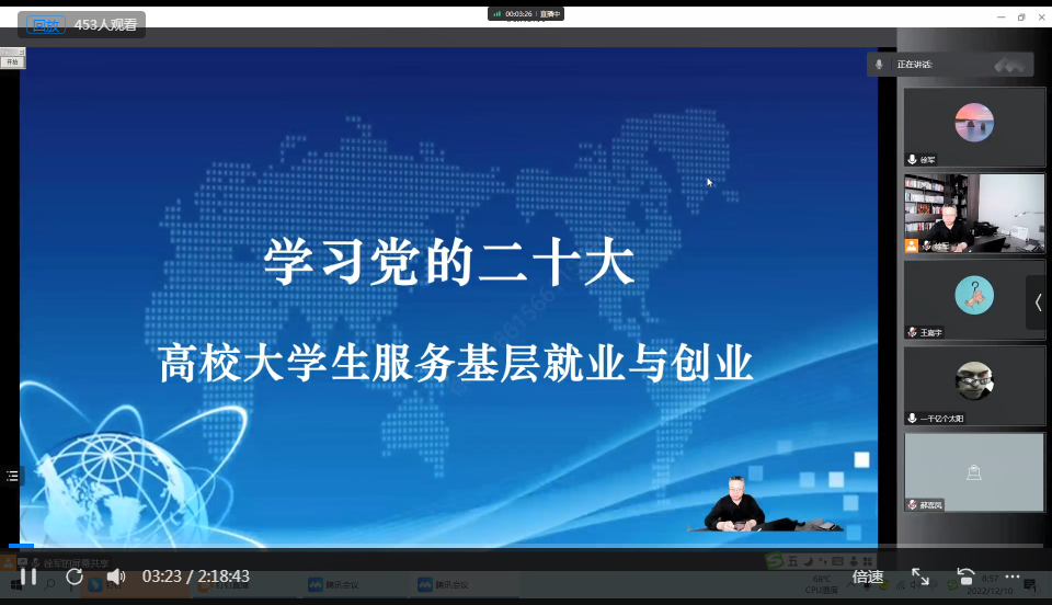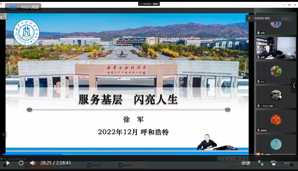 为深入学习贯彻党的二十大精神,进一步落实2023届全国普通高校毕业生就业创业工作网络视频会议要求,按照自治区教育厅和学校就业创业工作部署,数学与大数据学院于12月10日上午通过钉钉平台举办了以《服务基层 点亮人生》为题的专题辅导讲座。本次讲座邀请了来自内蒙古财经大学创业学院副院长徐军副教授主讲。学院全体师生共458人参加。讲座由学院党总支副书记郝喜凤主持。
