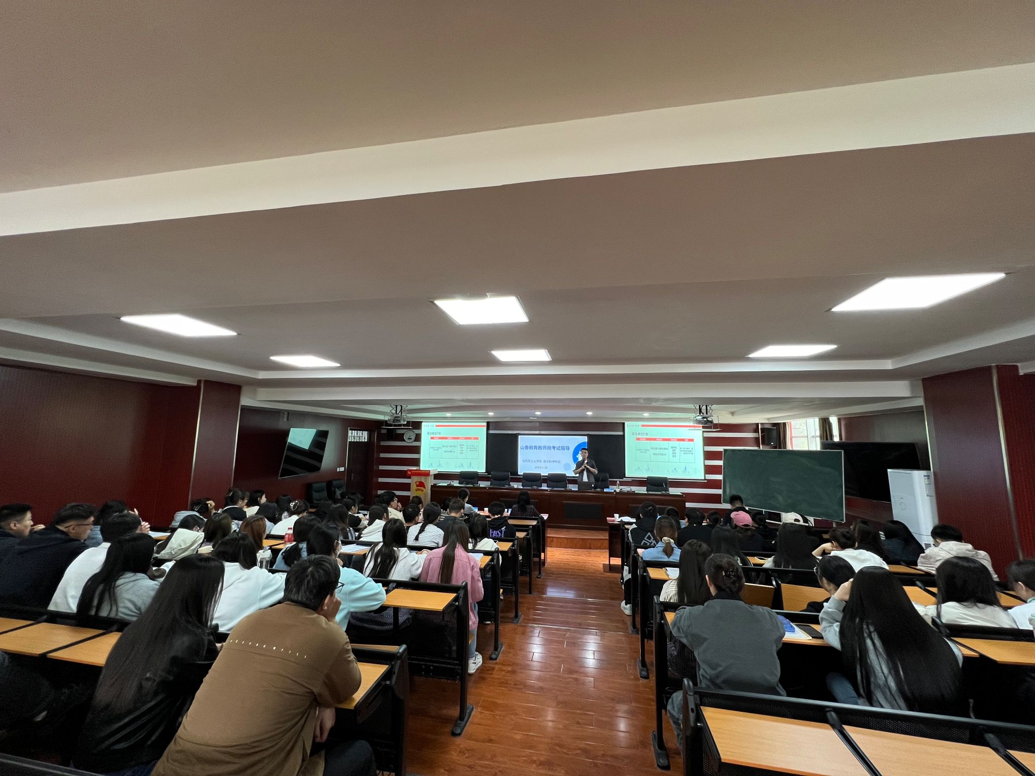 为持续推进就业指导服务和落实师范类认证工作,及时响应学生教师编制考试辅导需求,4月27日,马克思主义学院和数学科学学院在尚智楼413报告厅联合开展教师岗考试专题培训。特邀山香教育教师招聘考试研究院院长张俊刚主讲,马克思主义学院党总支副书记韩琼、数学科学学院教师刘爱春、马克思主义学院和数学科学学院毕业生96人参加,讲座由马克思主义学院教师威丽斯主持。
