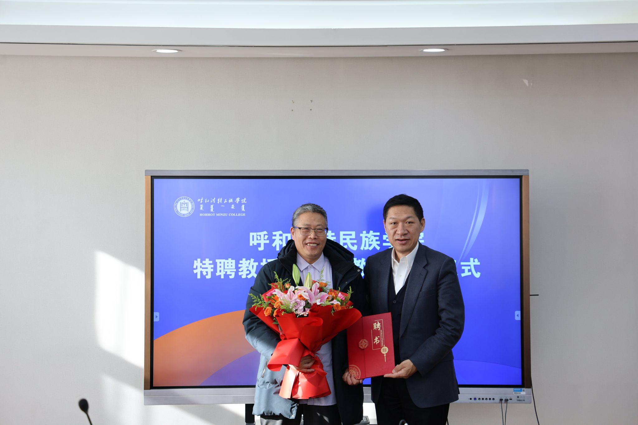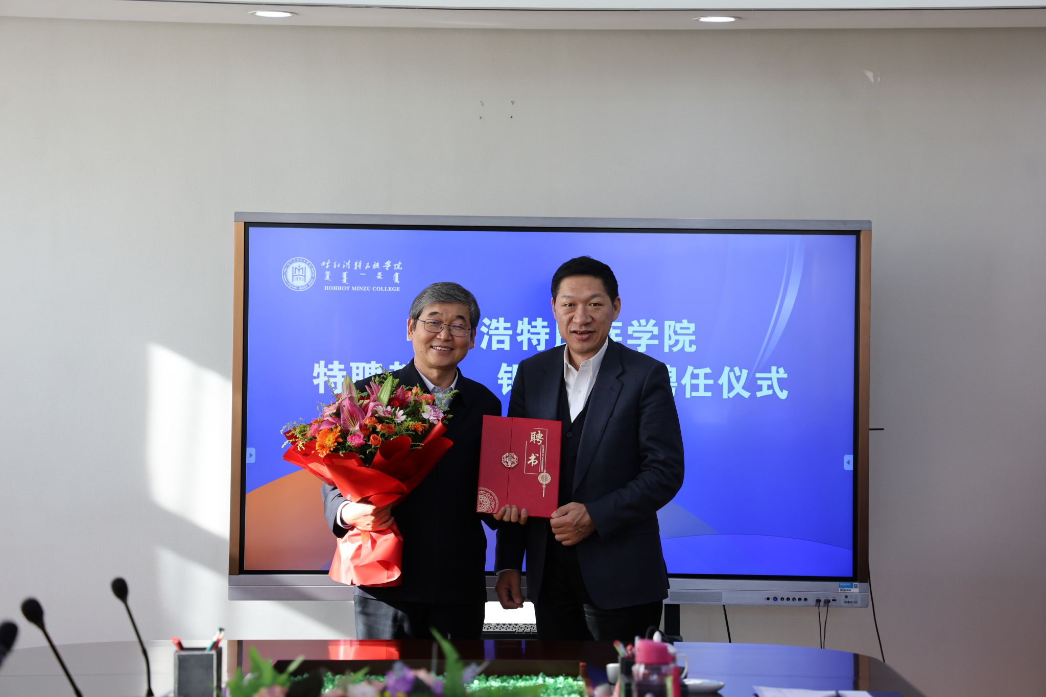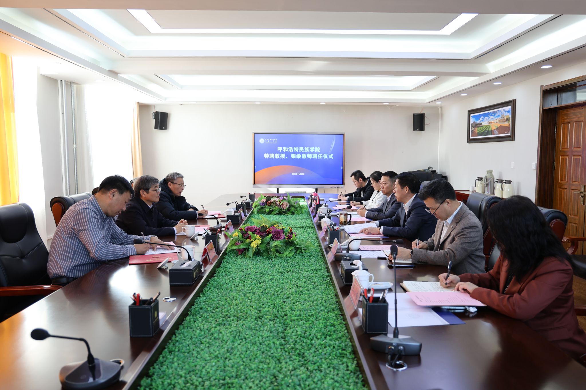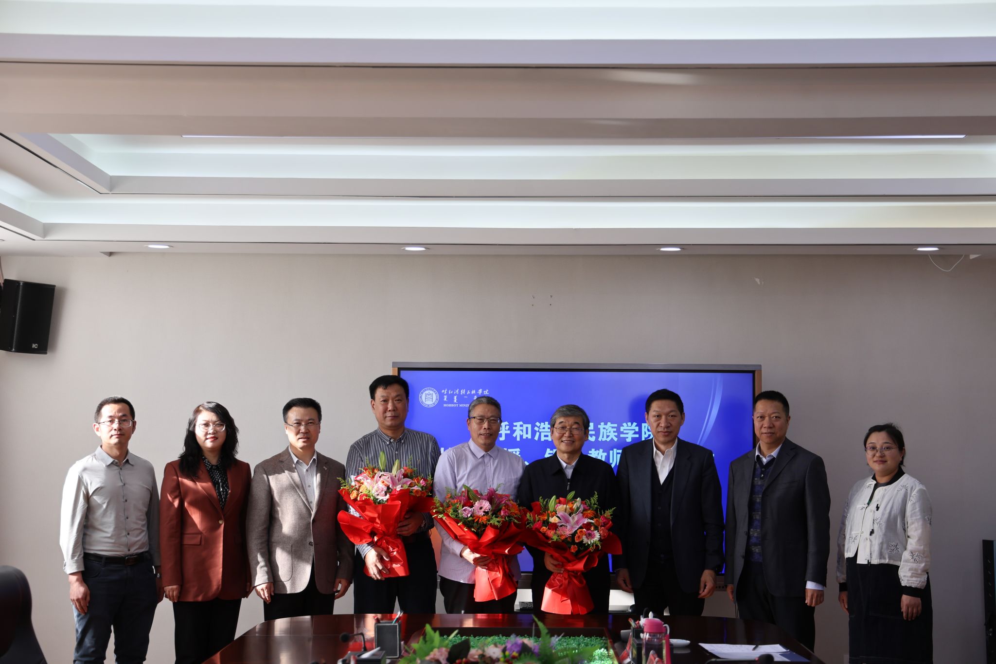 11月22日,学校在办公楼三楼会议室举行特聘教授、银龄教师聘任仪式。校党委书记刘九万出席会议并讲话,党委委员、副校长额尔敦布和,党委委员、副校长双虎出席会议,会议由双虎主持。