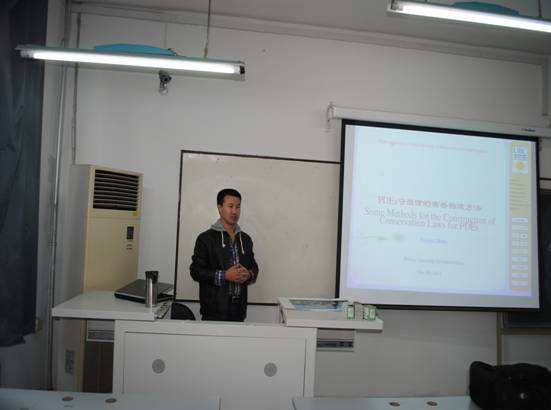 报告分两部分。首先,额教授就加拿大英属哥伦比亚大学做博士后一年的时间内,在学习方式、教学形式、学校管理、考试方式、地理和人文环境等方面的所见、所闻、所感与老师们做了分享。其次,额教授在《PDEs 守恒律的有些构造方法》的报告中,介绍了守恒律的重要性及Nōēther theorem 、Direct method、Linearizing operator method 、Symmetry action on know conversation laws、Auxiliary equations method等PDEs 守恒律的构造方法,重点讲述了本人在完善Linearizing operator method方面做的一些工作、成果等。会后,专家、老师们进行了热烈的讨论和交流。最后,阿副院长作了总结,对数学系以后的科研工作作了展望,鼓励大家做好科研,促进数学系科研水平的整体提高。(刘爱春报道,额尔敦其其格审核)