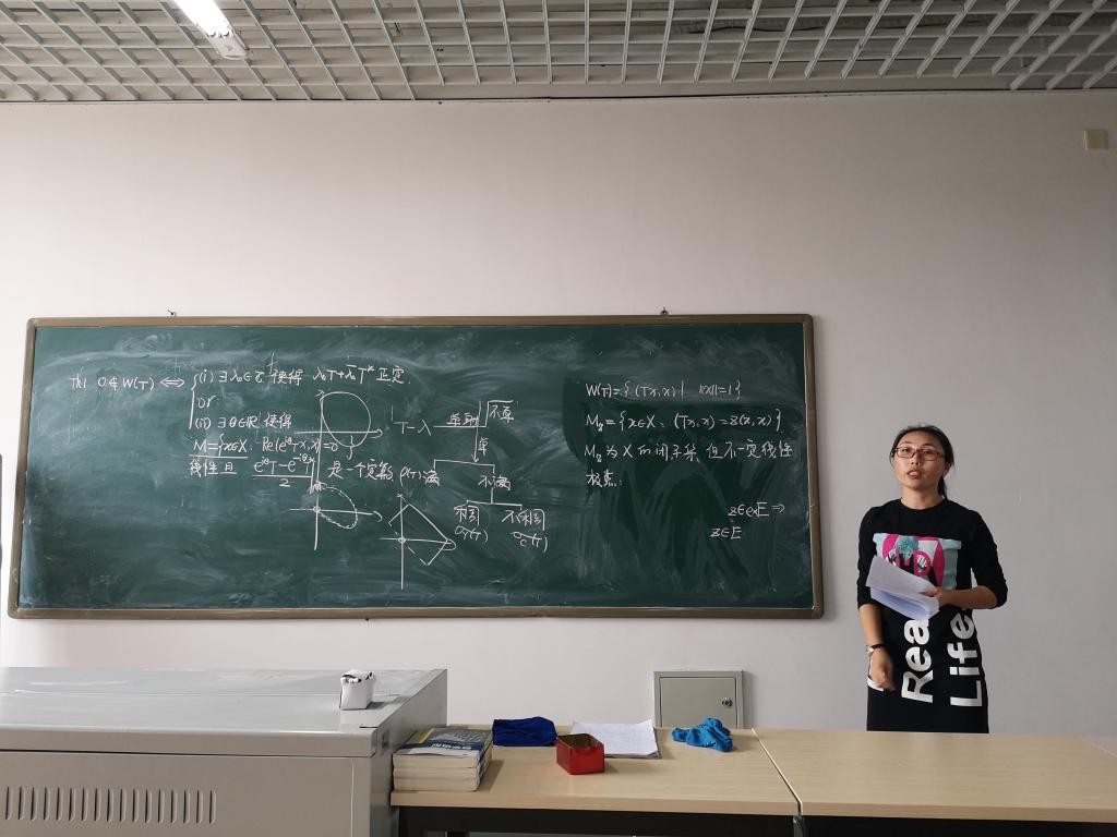 2018年10月18日,吴晓红博士在第二次学术讨论课上作了“关于零属于数值域的问题研究”的报告。数值域在研究算子的谱问题中扮演着非常重要的角色,吴晓红老师由 P.J. Psarrakos 和M.J. Tsatsomeros 提出的公开问题引入报告题目,介绍了零属于数值域的充分必要条件。在此基础上,进一步讲解了数值域的闭性的一种简单刻画。