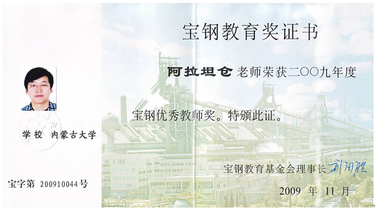 8.质量工程:2009年宝钢优秀教师奖证书(获得者:阿拉坦仓)