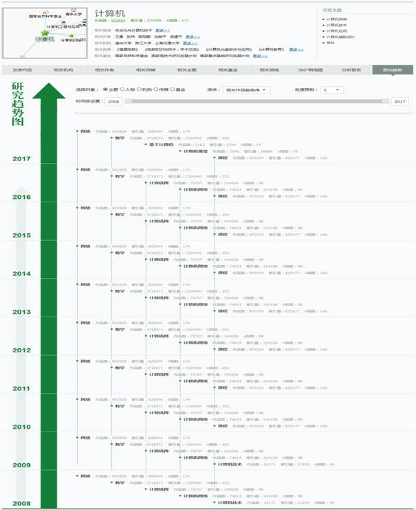 以“计算机”为例,在研究趋势的分析页面上,可以看到该主题下,每年的相关主题变化情况和研究的发展趋势。