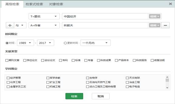 如需查看标题包含“中国经济”,作者为“林毅夫”的文献,则可以在高级检索-向导式检索页面做以下设置: