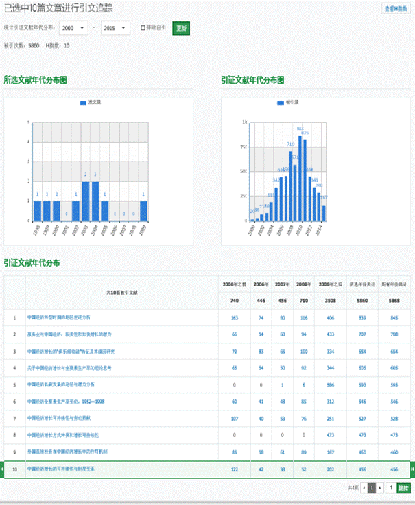 引用追踪分析:平台支持单篇或多篇文献的引用分析报告查看,您可以在文献列表页勾选目标文献,点击“引用追踪”按钮后,实现相应信息浏览;
