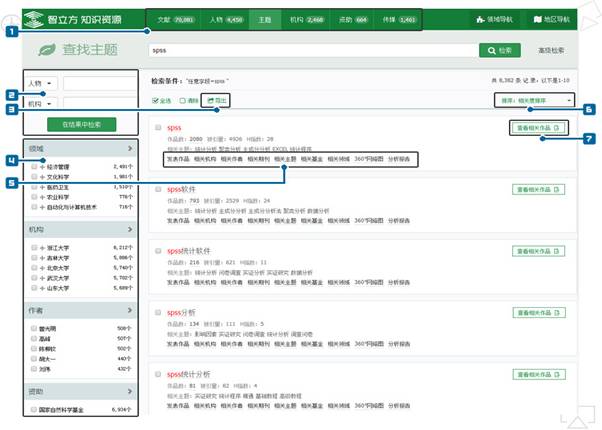 查询对象切换:平台提供“文章”、“传媒”、“主题”、“人物”、“机构”、“资助”对象切换,您可以点击不同的对象模块按需查看;