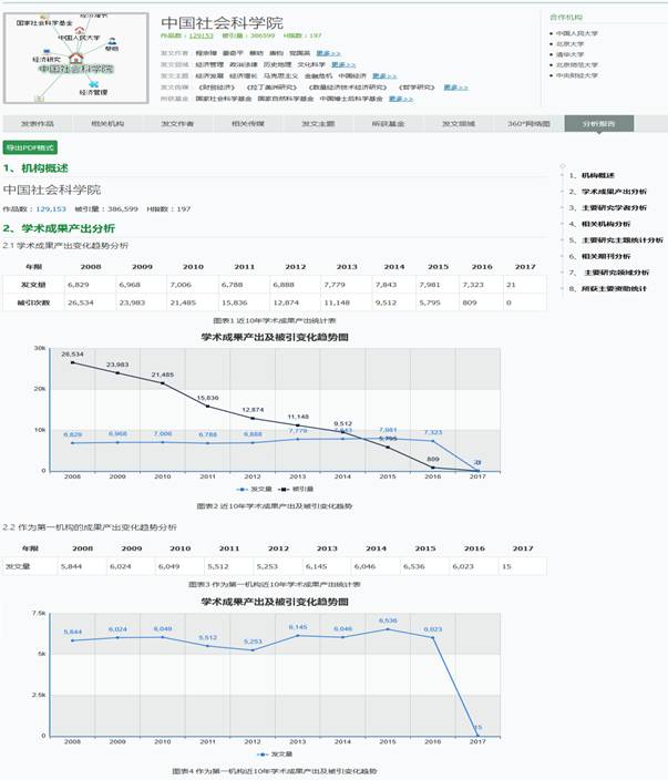 范例:如需查看“中国社会科学院”的学术计量报告,您可以在平台首页进行对象检索,进入该对象细览页后点击“分析报告”按钮,即可查看相应内容。