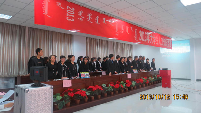 10月12日下午,2013年大学生《观乎人文 化成天下》人文知识竞赛决赛在综合楼十二楼会议室举行。科技处副处长额尔敦布和、汉语言文学系党总支副书记崔凤珍、党委办公室秘书科负责人包冬梅、团委书记阿古拉、团委副书记海霞担任了本场比赛的评委。