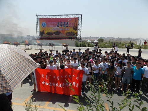 6月3日,“6·3”虎门销烟纪念日174周年之际,内蒙古自治区禁毒办、呼和浩特市禁毒办共同举办了焚毁毒品活动,对近年来的部分盟市已破获的7000余起毒品案件中缴获的各类毒品(以海洛因、冰毒为主)共计240公斤进行了焚烧销毁。我系爱如娜老师带领2012级法律事务1、2、3、4班共135名同学参加了此次活动。