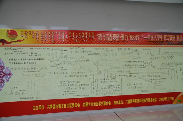 5月27日下午,由自治区团委、学联举办的“放飞青春梦想•聚力‘8337’”主题全区大学生书写梦想寄语未来活动在我院图书馆二楼报告厅隆重举行。自治区团委陈晓东副书记、学院胡春梅副院长、自治区团委学校部齐斯琴副部长、驻呼高校团委书记出席本次活动。我院共青团干部、学生干部共700余人参加本次活动。