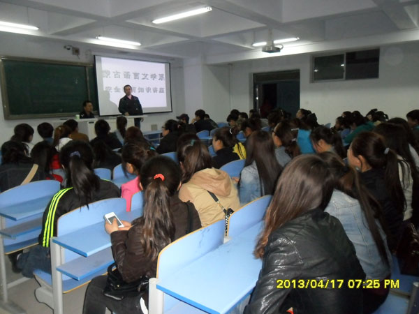为增强学生安全防范意识2013年4月17日晚7:30,蒙古语言文学系团总支组织2012级全体学生和学生干部在新教学楼418教室,邀请院保卫处郭明君老师开展了校园安全教育知识讲座。