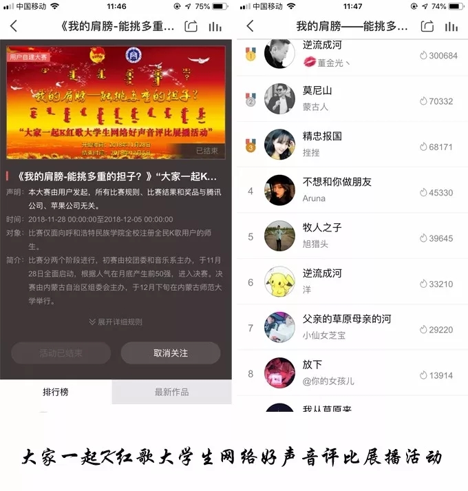 (六)“大家一起K红歌”大学生网络好声音评比展播活动:共有40多名学生网上报名参加了本次活动。