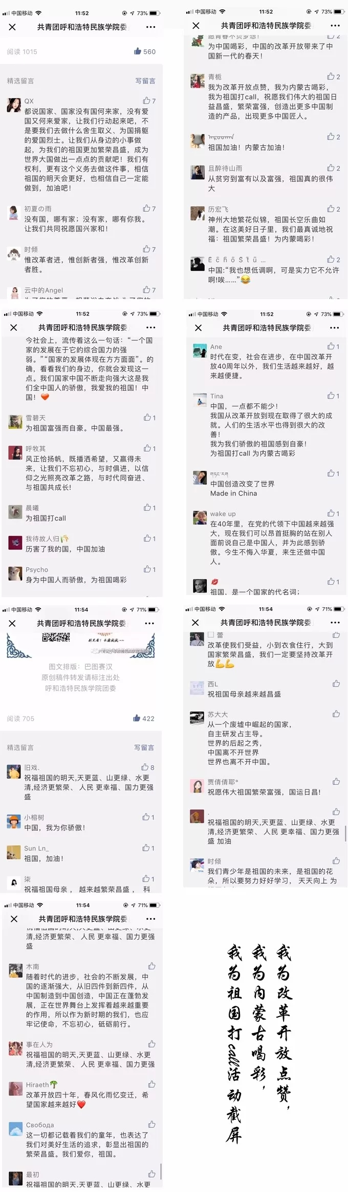 (二)“我为改革开放点赞,我为内蒙古喝彩,我为祖国打call”大学生网上留言活动:结合青年学生习惯和特点,学校团委在微信公众平台精心设计起了“改革开放四十年,春风化雨忆变迁”和“我为改革开放点赞,我为内蒙古喝彩,我为祖国打call”两条推送,吸引广大学生积极参与、踊跃留言,不断激发广大学生的爱国、爱党热情,汇聚广大青年坚定“四个自信”“将改革进行到底”的精神力量。留言活动累计阅读人数:1720人次,点赞数:982次,留言数:642条。