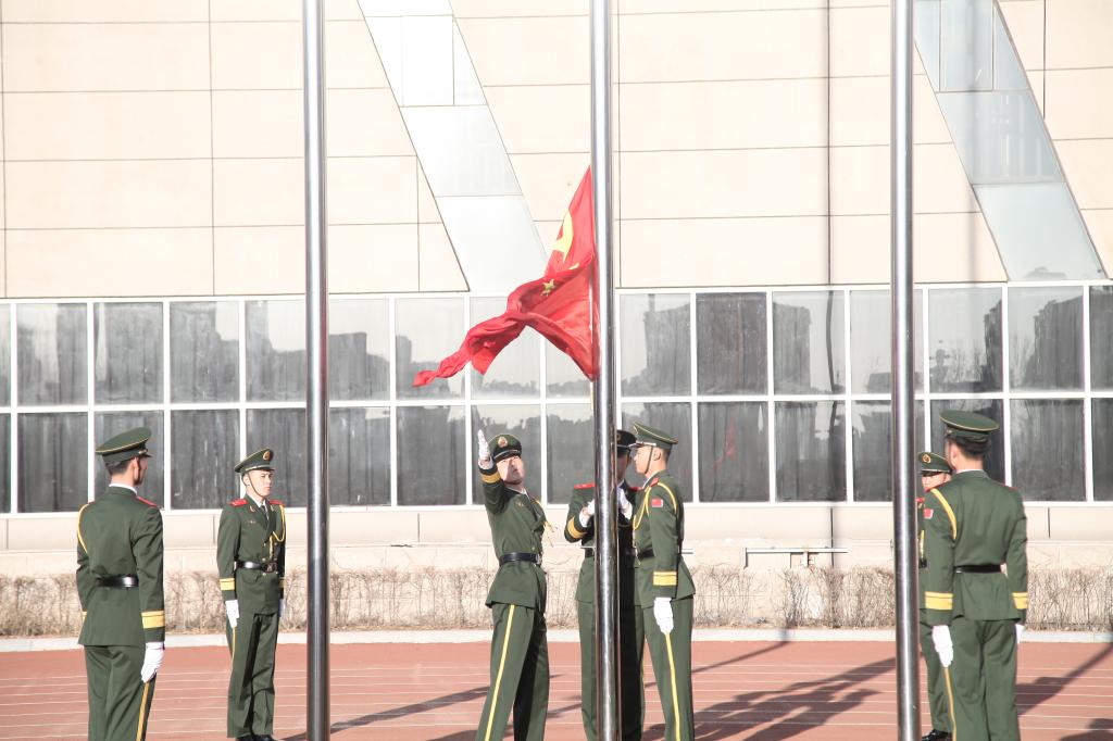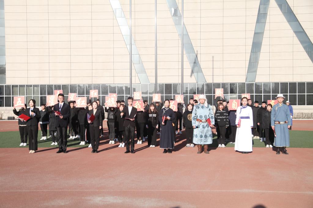 7:30,升国旗仪式开始,国旗队踏着整齐划一、铿锵有力的步伐完成了出旗,伴随着庄严的《义勇军进行曲》鲜红的五星红旗冉冉升起,迎风飘扬。全体师生怀着崇敬与喜悦的心情,凝视着迎风飘扬的五星红旗,心中无比自豪。在飘扬的国旗下,汉语言文学系48名学生随着悠扬地乐曲朗诵《五星红旗》来表达对祖国无限热爱和崇高敬意,高昂的朗诵声在每一位在场师生耳畔回荡,同时也向每一位热爱祖国、热爱党的师生们传达着祖国蓬勃的生机。