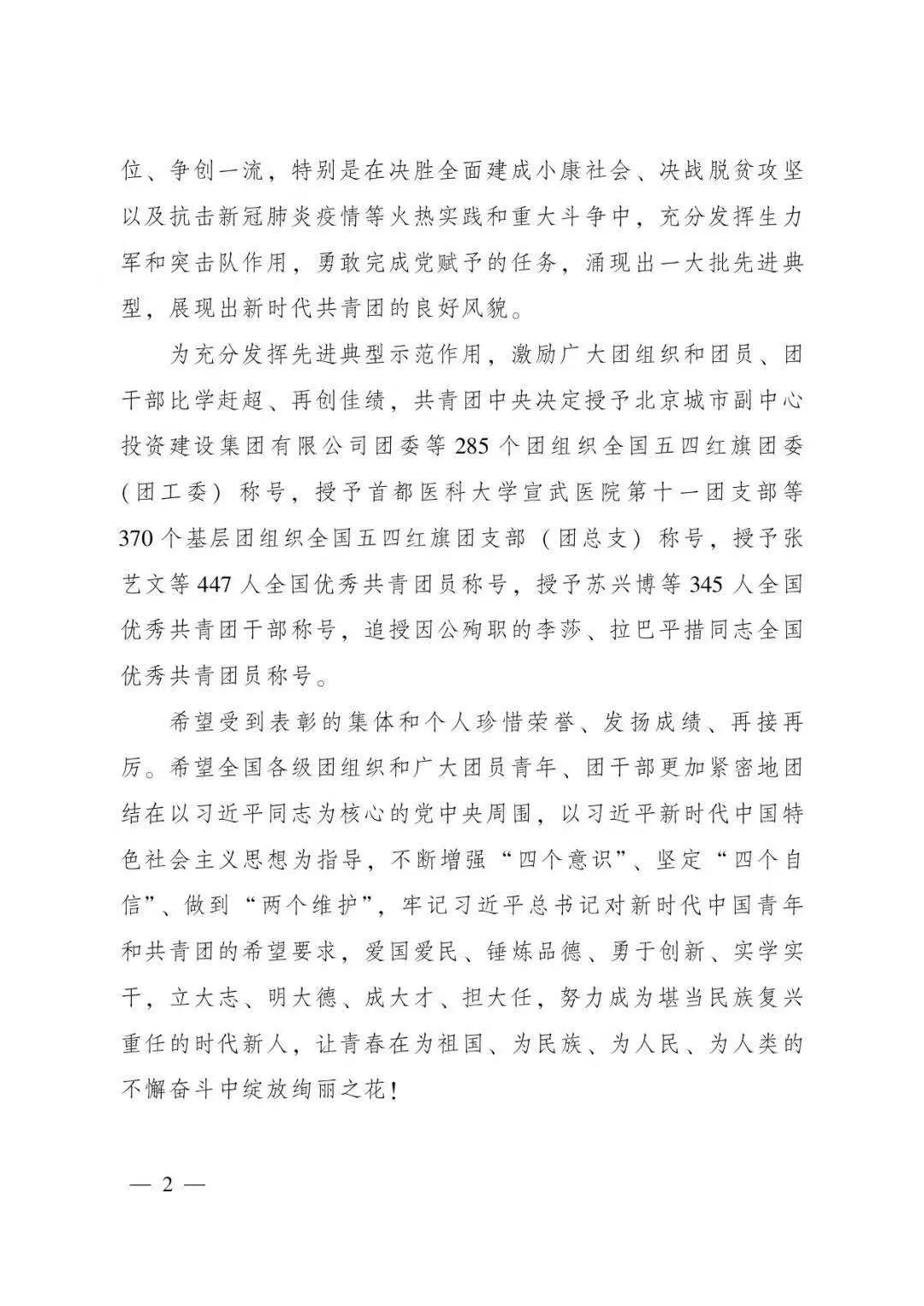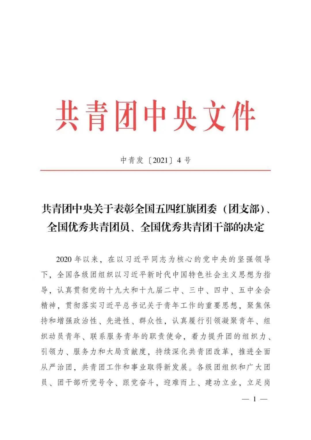 在中国共产党成立100周年和五四运动102周年来临之际,共青团中央印发了《共青团中央关于表彰全国五四红旗团委(团支部)、全国优秀共青团员、全国优秀共青团干部的决定》(中青发〔2021〕4号),对2020年度做出突出贡献和成绩的一批先进集体与个人进行表彰,365英国上市公司团委荣获“全国五四红旗团委”称号。