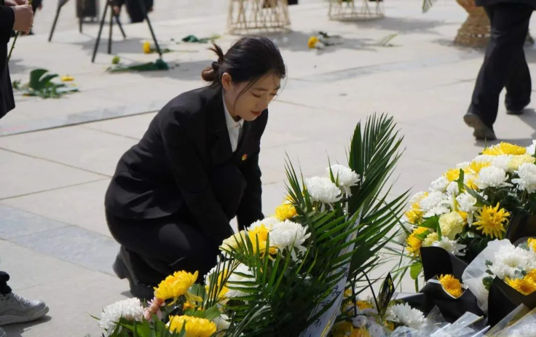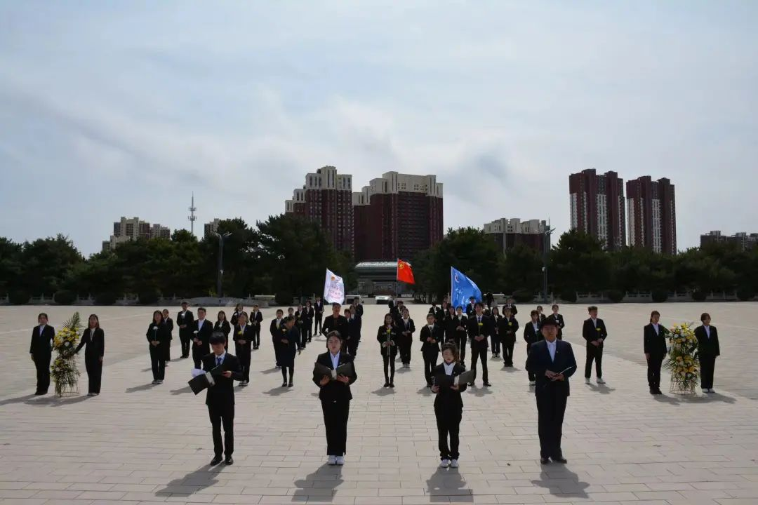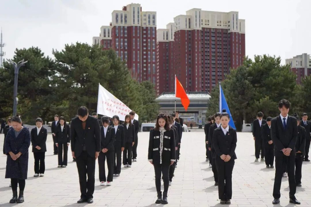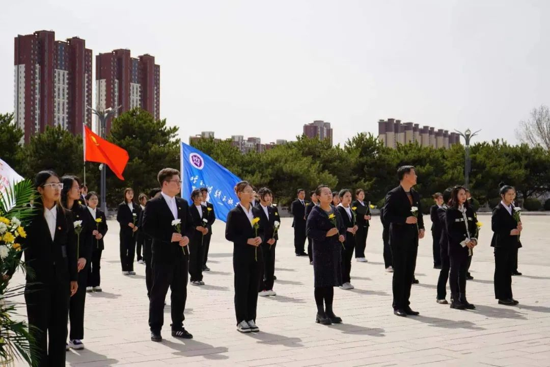 在庄严肃穆的烈士纪念碑前,全体师生整齐列队,向英烈们敬献鲜花,肃立默哀,深切表达对革命先烈们的追思之情。随后,师生们以深情的朗诵表达对烈士们无尽的哀思与怀念。