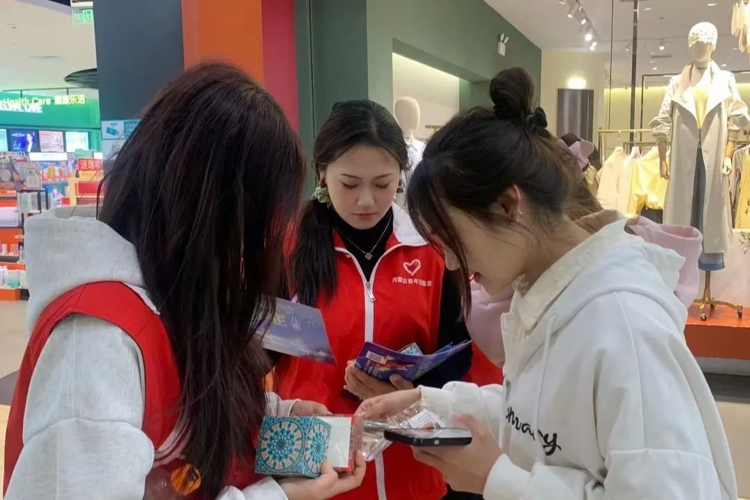 本次活动以组织义卖为主要形式,为孤独症孩子们募捐资金。活动伊始,志愿者们迅速集结领取义卖的工艺品,工艺品主要为自闭症孩子们亲手制作的手环以及香薰。志愿者们身着统一红色马甲,面带微笑,在义卖活动期间,主动热情地向商场内来往的人群发放“呼市爱加倍儿童公益残助中心”的相关宣传册,并且进行了细致的宣传和介绍。