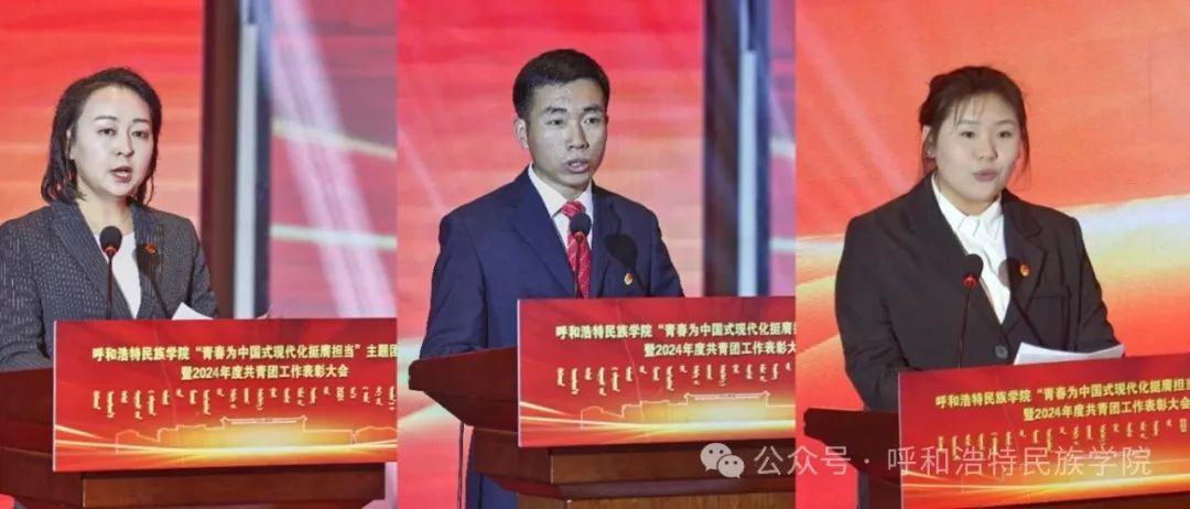 团委副书记乌依勒斯宣读了《2024—2025学年度“五·四”先进集体及先进个人的表彰决定》。获奖代表管理学院团总支书记宝连、化学与环境工程学院学生吴思彤发言。