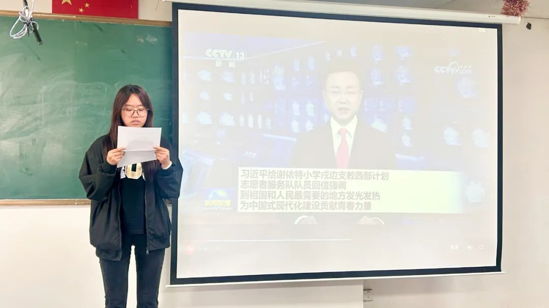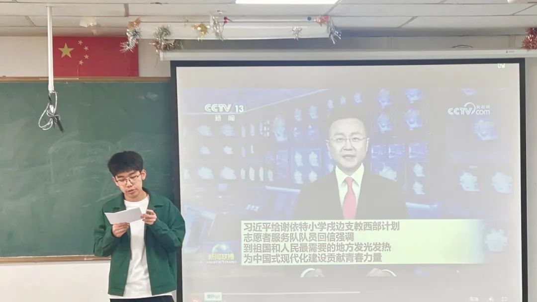 学习伊始全体观看《习近平给谢依特小学戍边支教西部计划志愿者服务队队员回信》新闻联播视频,并就回信精神展开热列讨论。