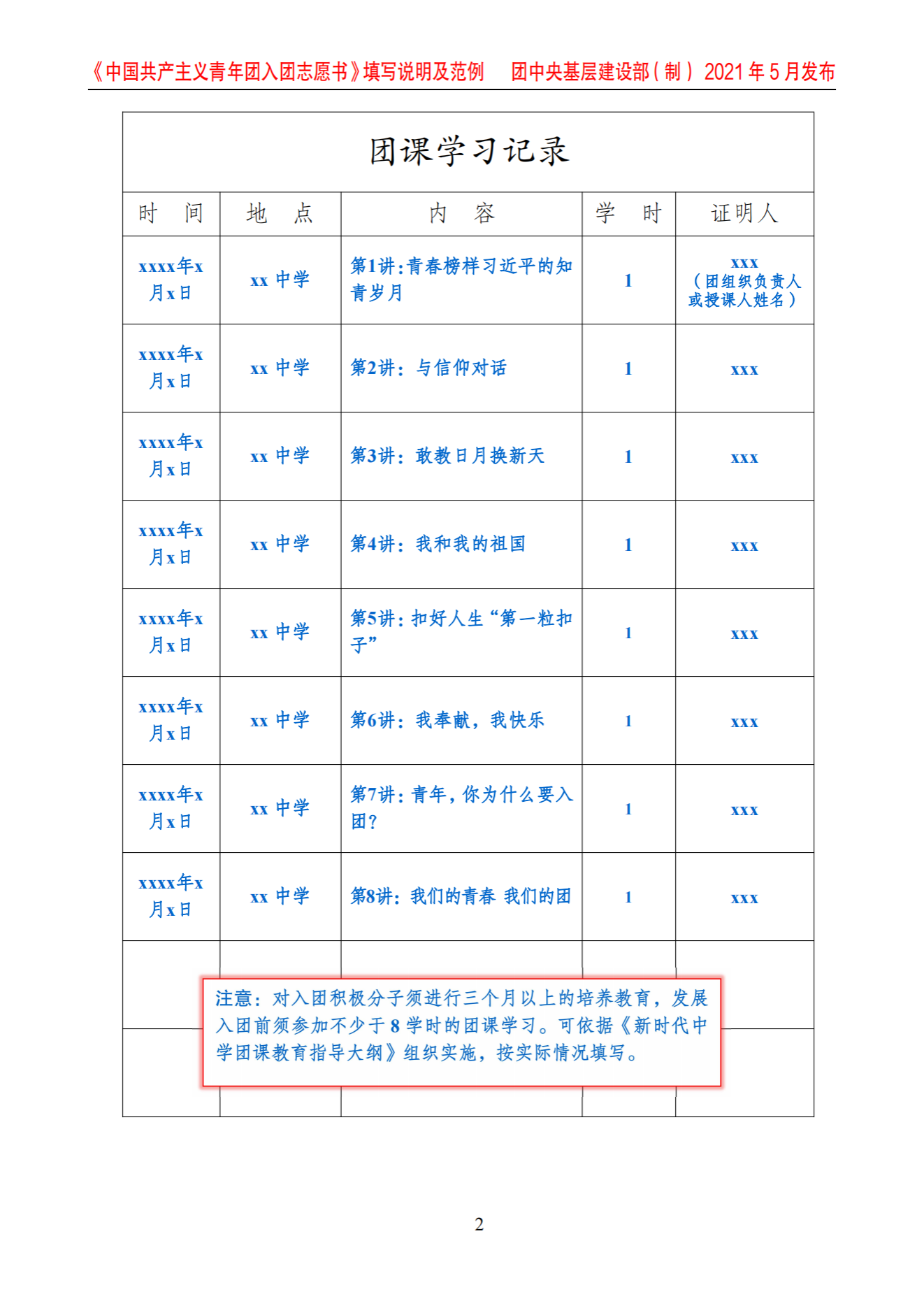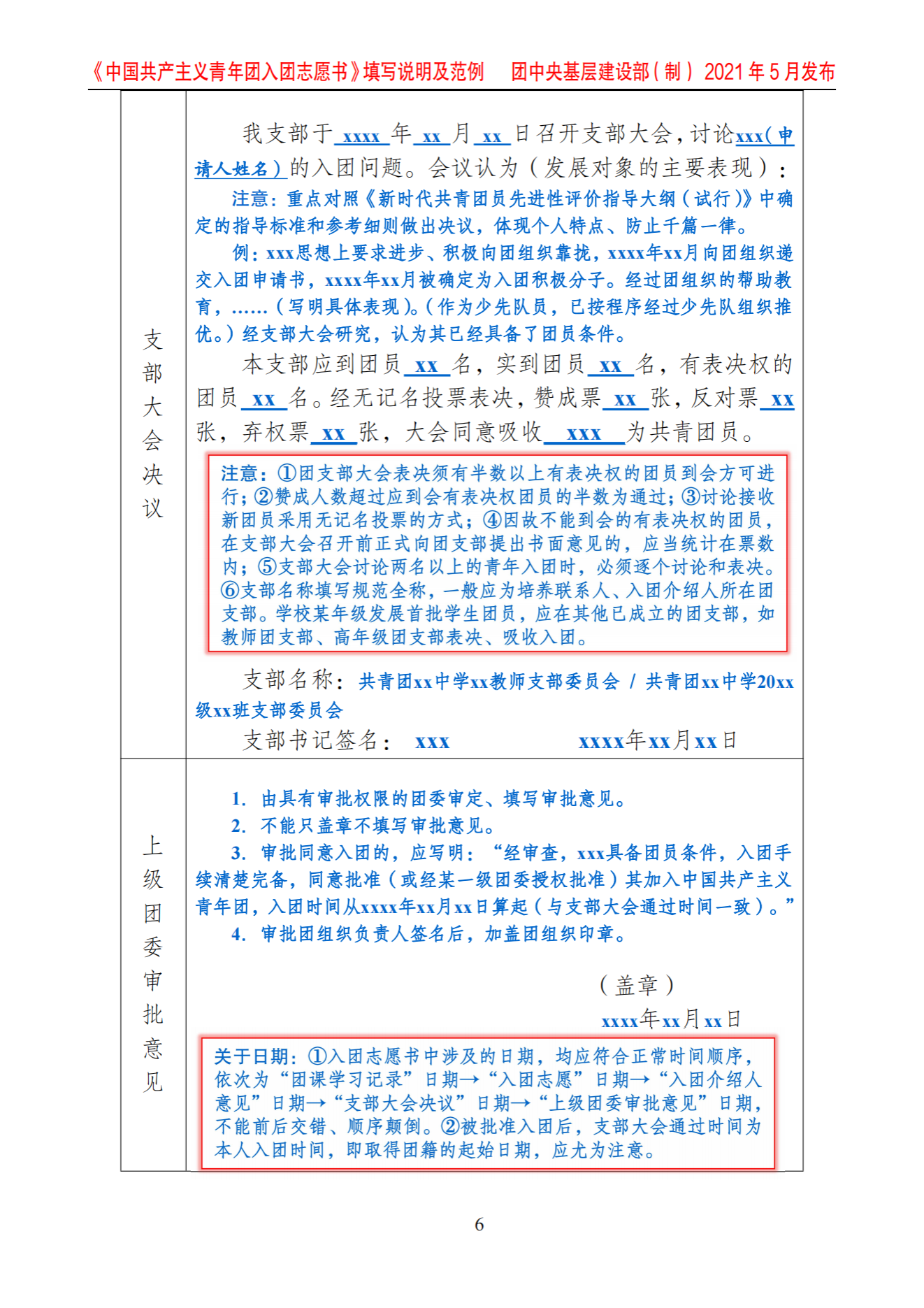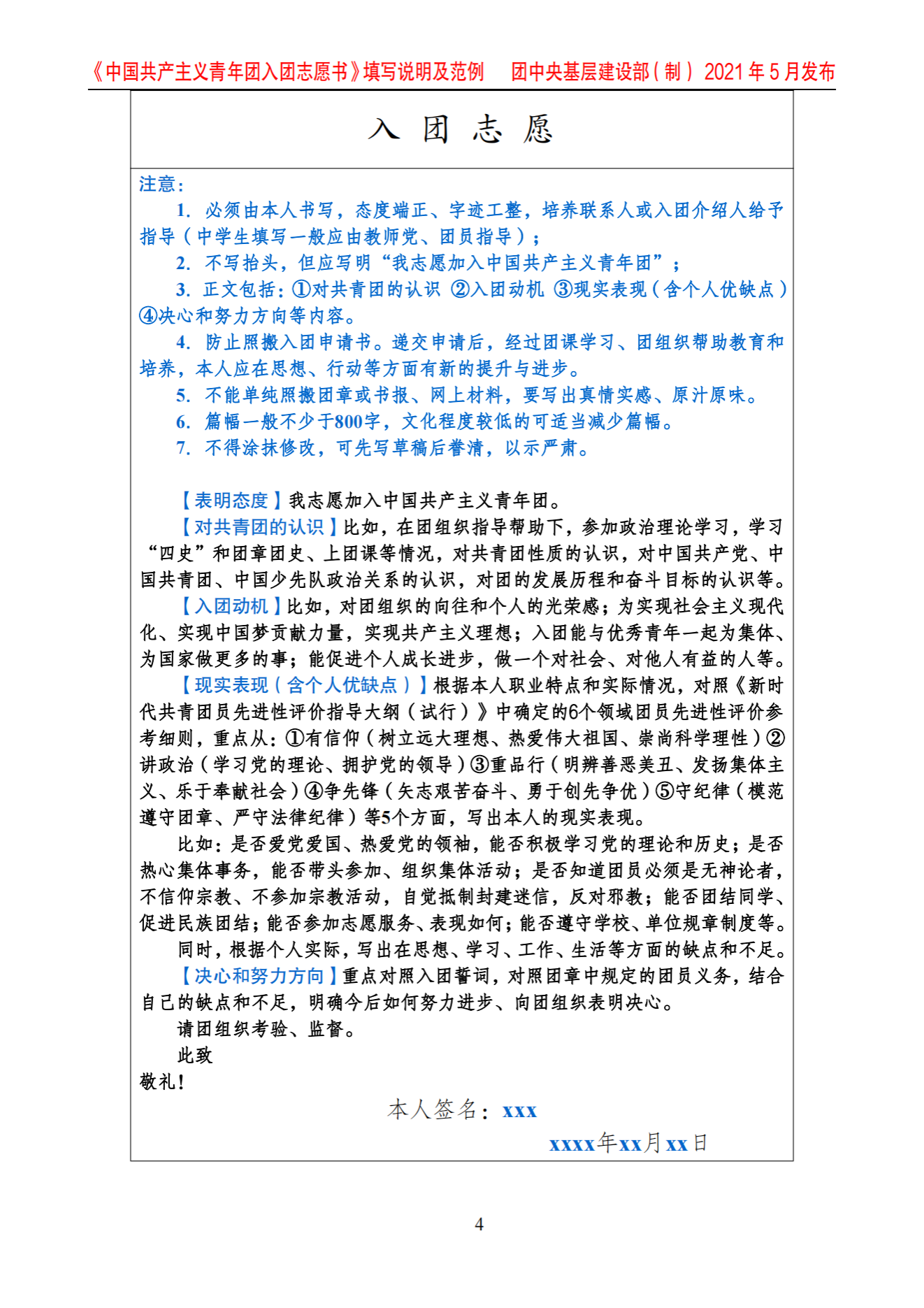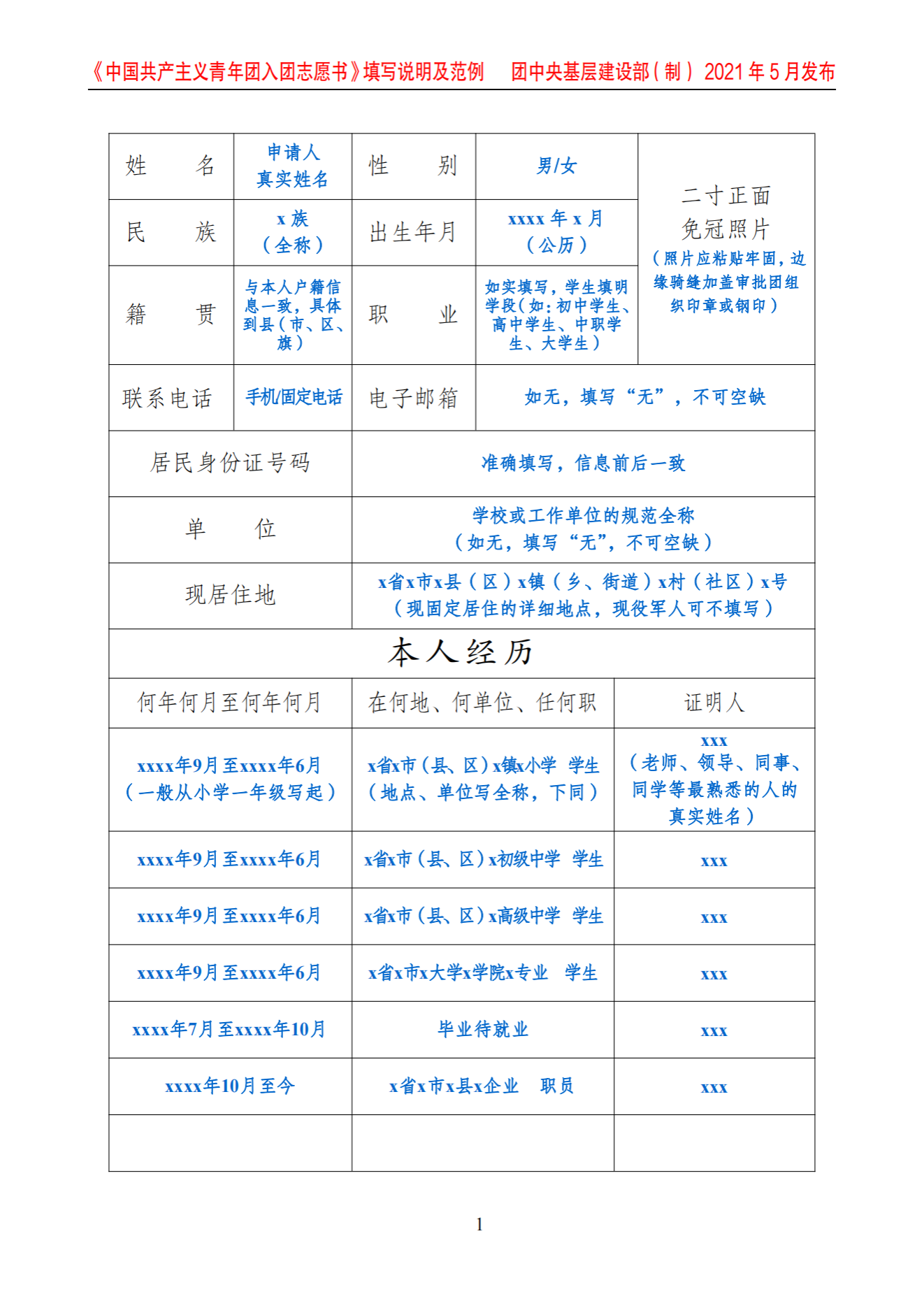 《中国共产主义青年团入团志愿书》填写说明及范例