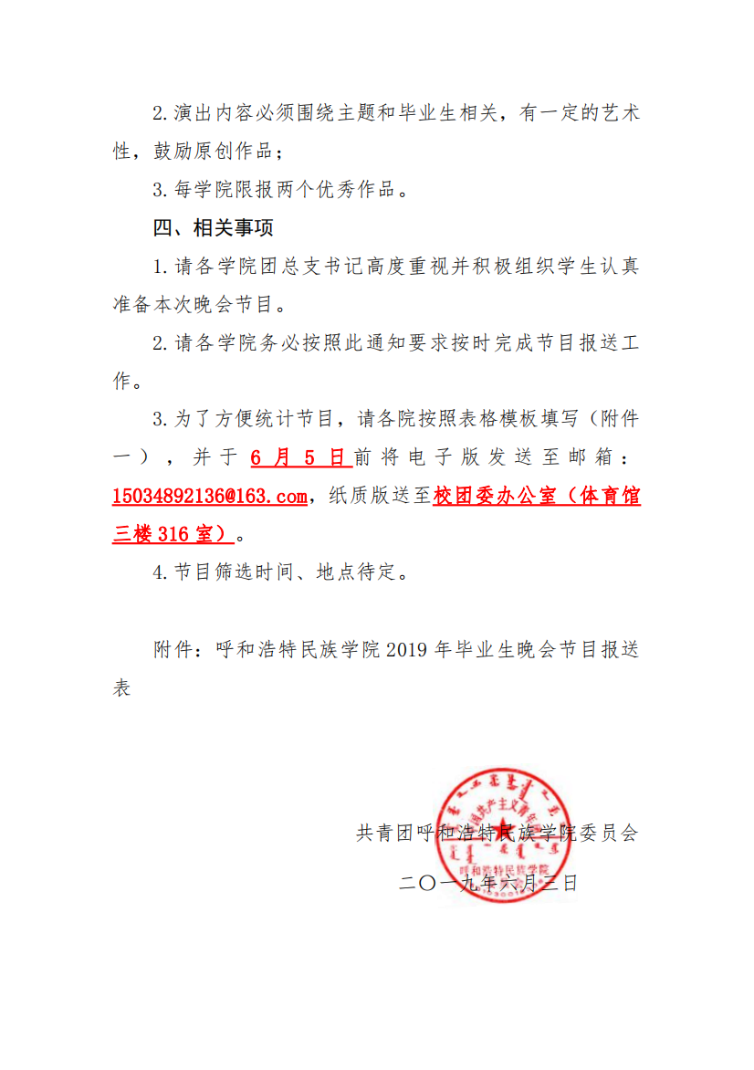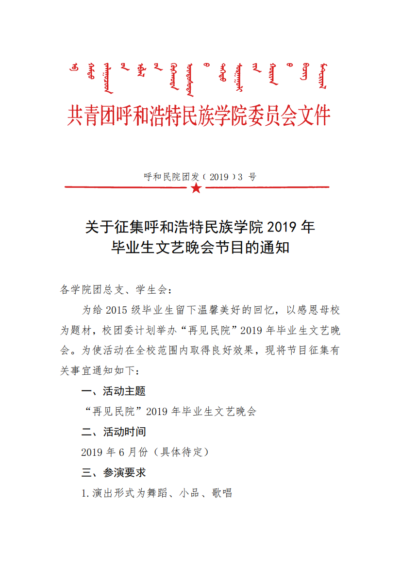 呼和民院团发[2019]3号文件“关于征集365英国上市公司2019年毕业生文艺晚会节目的通知”