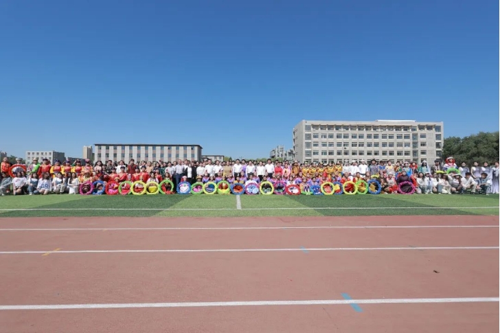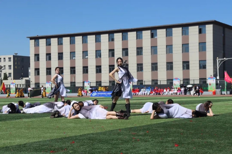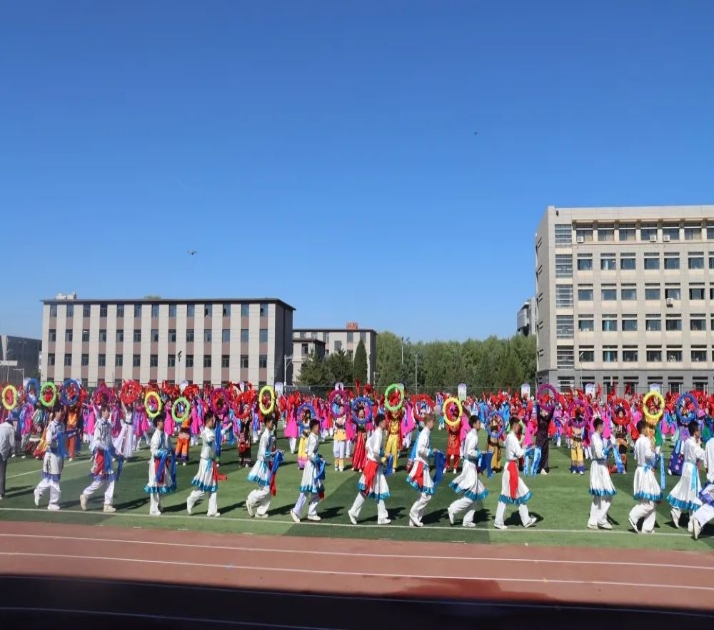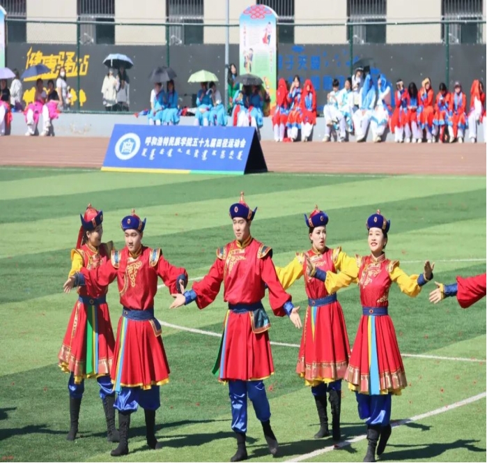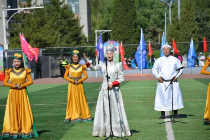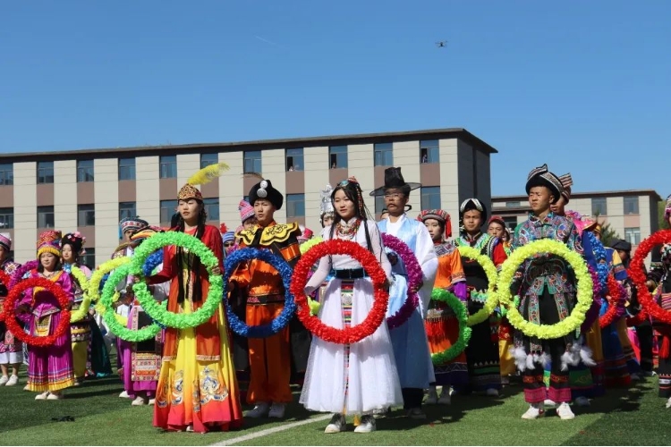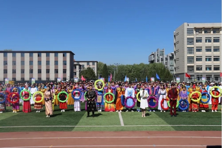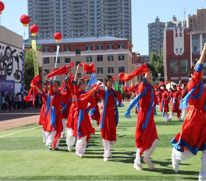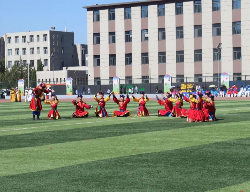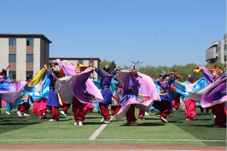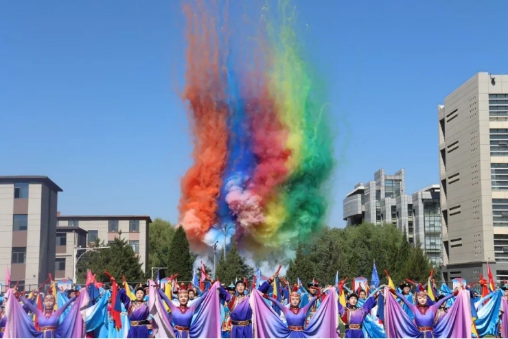 656名同学组成的大型舞蹈《欢庆》作为本次那达慕文化节文艺演出的开场舞,56个民族拥舞着同心圆,象征着56个民族团结一心、同舟共济,圣洁的哈达传递着各民族之间的友好情谊,甩巾、摆巾、绕巾等动作优美潇洒的展示是与安代舞蹈的完美邂逅,飘动的绸带让五种颜色汇成了一片绽放的花海。