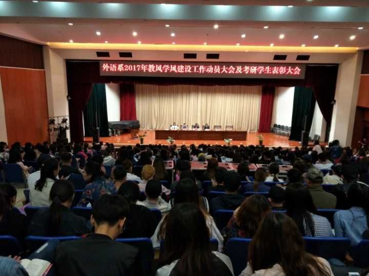 为进一步加强外语系教风学风建设,不断加强教学管理,提高办学水平和教学质量,增强管理服务能力,提高学生学习积极性,增强学生遵守纪律的自觉性,外语系于2017年6月6日晚7时在图书馆二楼报告厅召开教风学风建设动员大会及考研学生表彰大会。外语系全体教师以及2014级、2015级、2016级全体学生600余人参加了会议,团总支负责人王春梅主持了本次会议。