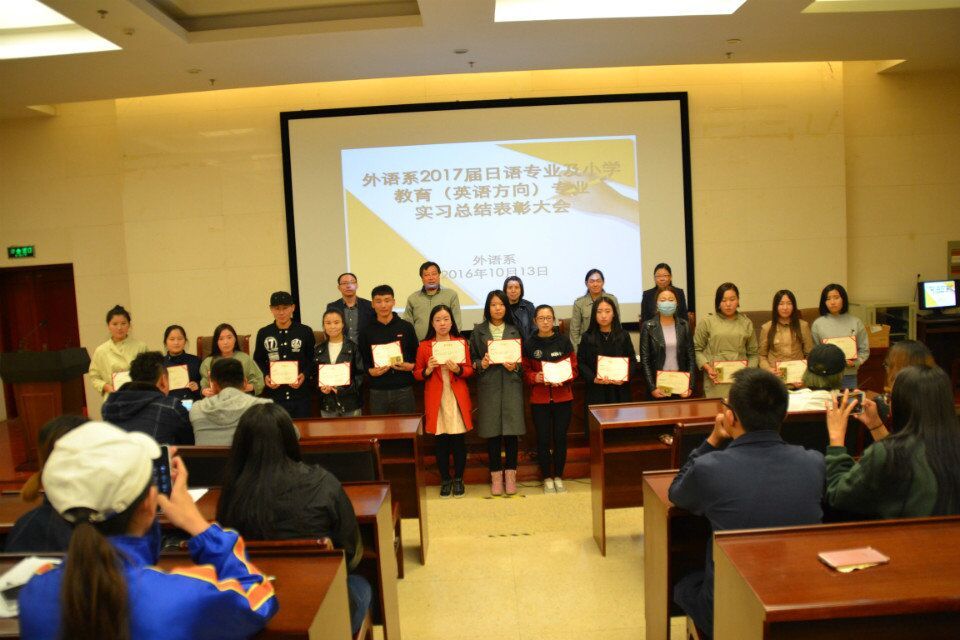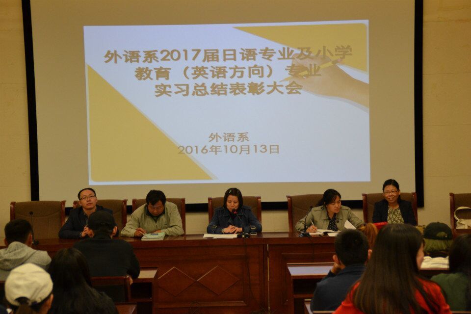 外语系于2016年10月13日下午在图书馆一楼报告厅隆重召开了2017届小学教育(英语方向)专业及日语专业毕业实习工作总结及表彰大会。外语系肖查娜主任、日语教研室包金山主任、英语教研室红霞主任、实习指导教师、2017届日语专业及小学教育(英语方向)专业全体毕业生出席了本次大会。会议由肖查娜主任主持。