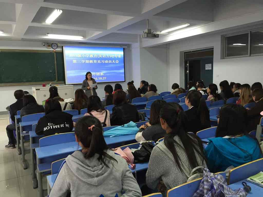 外语系将本学期的教育见习周安排在2016年10月31日至11月11日。并于2016年10月28日,在新教学楼604教室召开了教育见习动员大会。见习指导教师、见习学生近100人参加了会议。动员大会由英语教研室主任红霞主持。红霞主任宣读了见习方案,下达见习任务,明确纪律要求,为学生顺利完成见习任务打下良好的基础。她还特别强调见习的重要意义,要求学生珍惜来之不易的实践机会,用自己的出色表现为自己的将来铺好路。