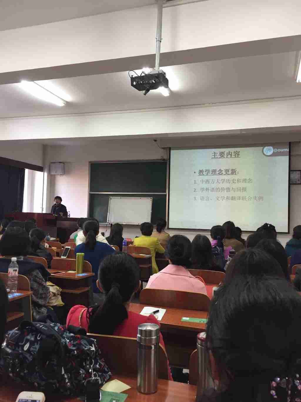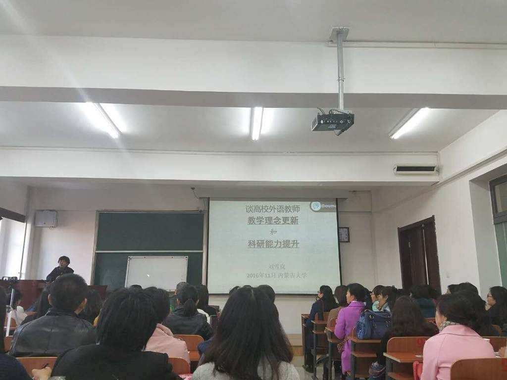 2016年11月4日下午2:30,外语系派出11名英语专业教师前往内蒙古大学听取中国社会科学院外国文学研究所英美文学研究室刘雪岚副研究员所做的题为《谈高校外语教师教学理念更新与科研能力提升》的讲座。讲座在内蒙古大学北校区研究生楼309教室进行。