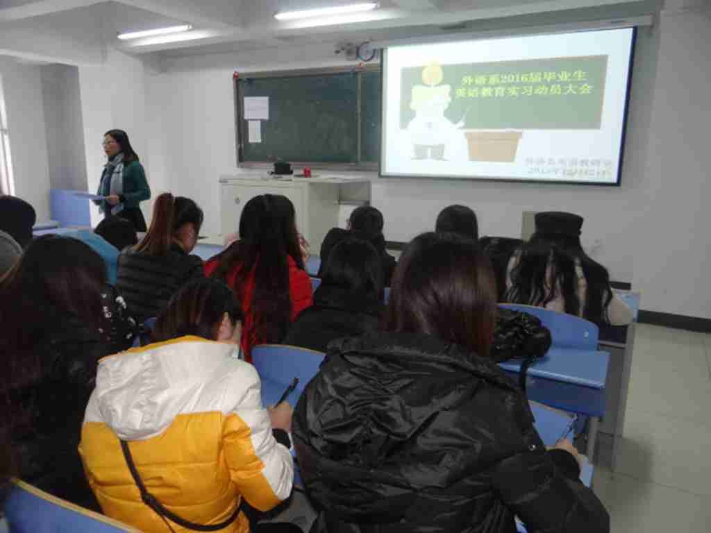 2015年12月12日上午10点,外语系在都林楼518教室举行了2016届英语教育专业实习动员大会。会议由外语系英语教研室主任红霞主持,参与实习的2016届英语教育专业119名学生参加了动员大会。