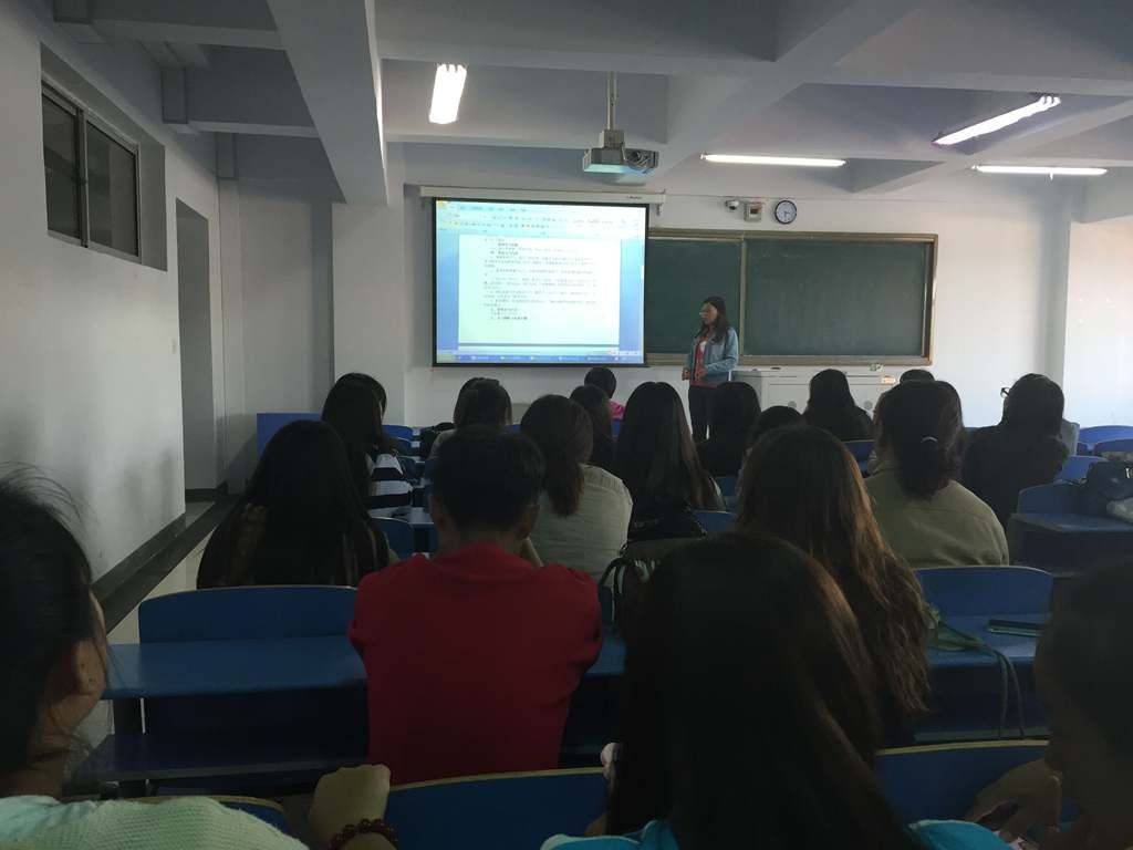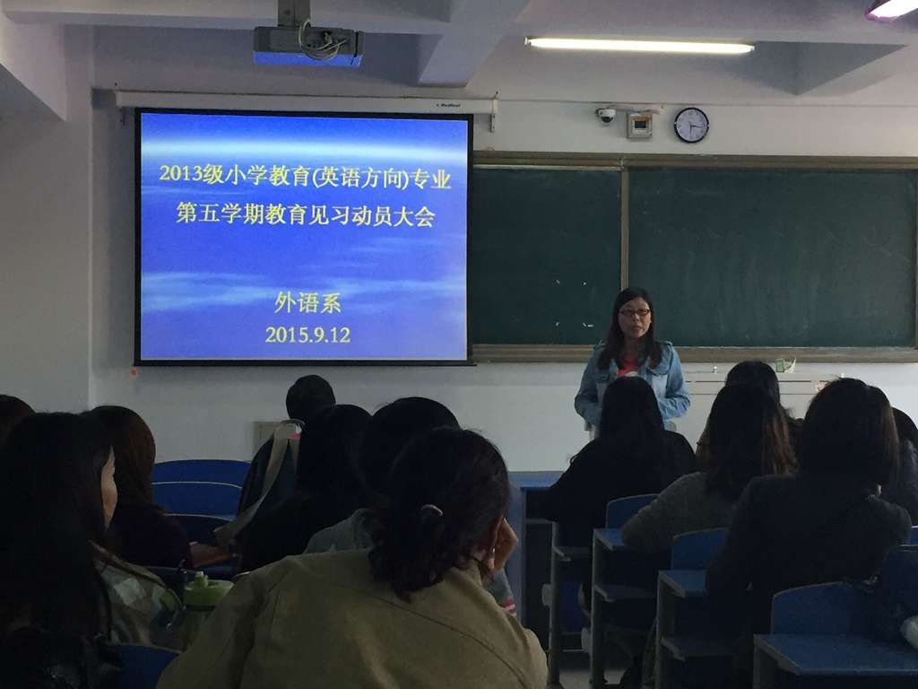 外语系于2015年9月12日下午5时在都林楼602教室举行了外语系2013级小学教育(英语方向)专业第五学期教育见习动员大会。大会由外语系英语教研室主任红霞主持,见习指导教师陈玉红及2013级小学教育(英语方向)专业一、二班全体学生在座。会议开始,由红霞老师介绍《外语系2013级小学教育(英语方向)专业第五学期见习方案》,明确了教育见习目的和任务、教育见习内容、教育见习形式及对指导教师的要求。随后,她宣读分组情况,并对全体见习生提出了严格的要求,要求学生们严格要求自己,认真对待教育见习的每一个环节,遵守见习时间、纪律,认真听课,圆满完成教育见习工作;希望所有见习生不断学习,全力以赴地完成见习工作。