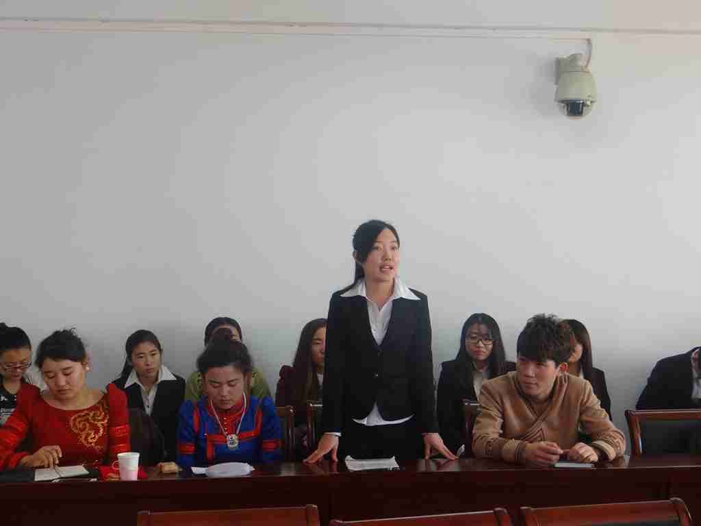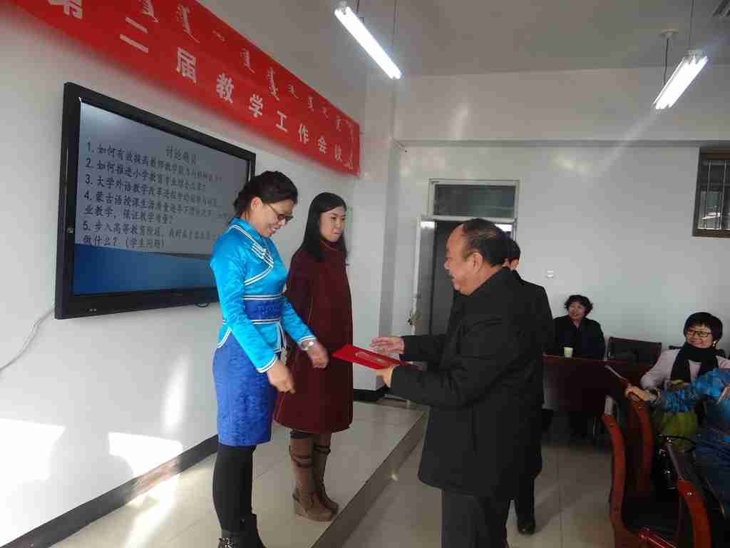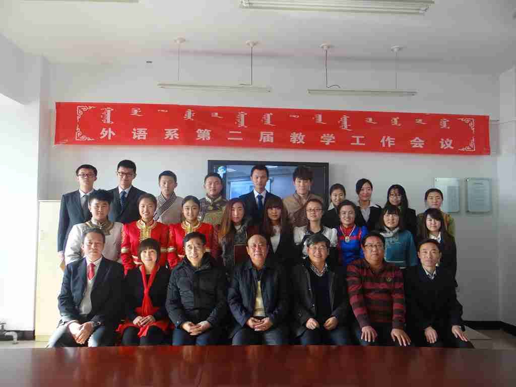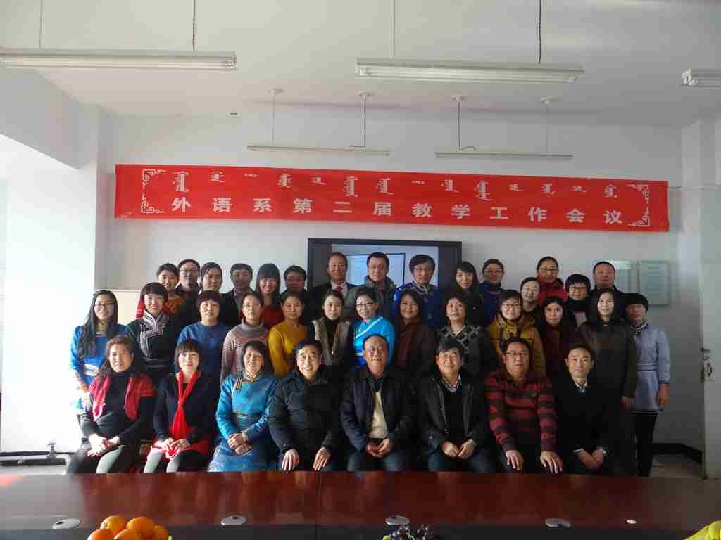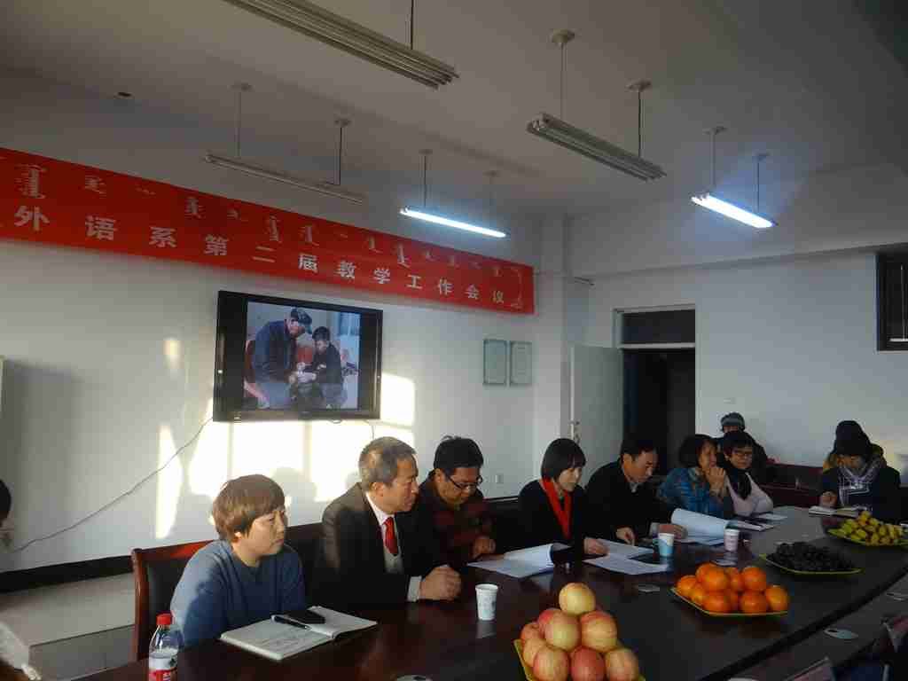 外语系主任肖查娜教授以《凝聚人心抓教学,务实创新求实效》为题,从教学工作总体思路、教学工作取得的实绩、教学工作中存在的突出问题,下一步教学工作思路四个方面对外语系2013、2014两个年度的教学工作作了全面汇报。外语系系副主任苏日嘎拉图副教授就外语系2013、2014两个年度的教学督导组工作作了汇报。外语系党总支书记布和朝鲁教授宣读了2014年度外语系表彰决定,对优秀教研室、先进工作者、教师教研、科研成果进行了表彰奖励。在随后的自由讨论环节,与会师生就如何有效提高教师教学能力与科研能力;如何推进小学教育专业综合改革;大学外语教学改革进程中的困难与对策;蒙古语授课生源质量逐年下滑状况下,如何实施专业教学,保证教学质量;步入高等教育阶段,我的成才需求是什么,我应该做什么等问题展开热烈讨论。