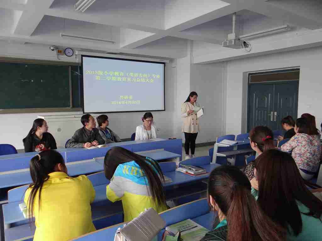 外语系于2014年4月30日下午4:40时在外语系618教室进行了外语系2013级小学教育(英语方向)专业第二学期教育见习总结大会。大会由外语系英语教研室负责人红霞主持,并作见习总结。其后, 2013级小学教育(英语方向)专业一班的乌雅罕同学和2013级小学教育(英语方向)专业二班的于莹同学代表见习生发言。最后,系副主任苏日嘎拉图老师对见习工作进行了全面总结,并对见习生寄言,希望他们在以后的专业学习上继续努力,为将来做一名合格的小学英语教师做好充分的准备。