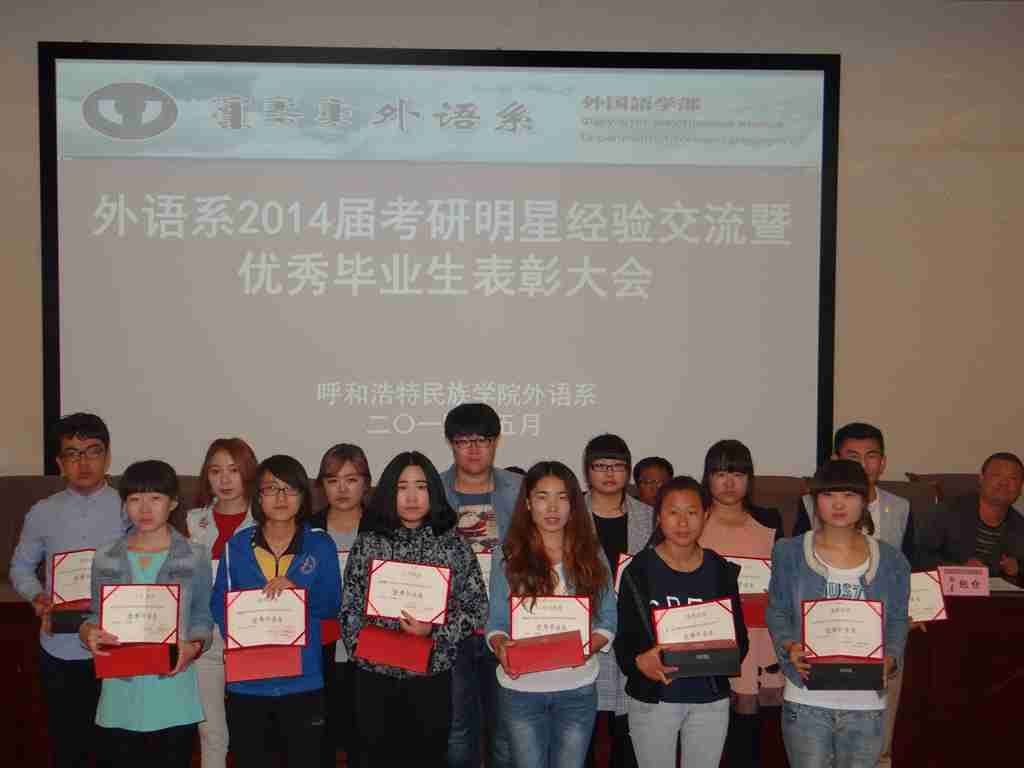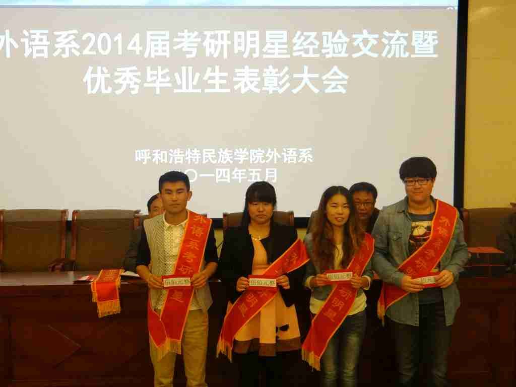 大会首先由肖查娜主任、苏日嘎拉图副主任、布和朝鲁书记分别宣读了《关于表彰2014届考取研究生同学的决定》、《关于表彰在“高教社杯”第十届全国高职高专实用英语口语大赛内蒙古赛区复赛中取得佳绩学生的决定》、《 2014届系优秀毕业生表彰决定》并绶带颁奖。