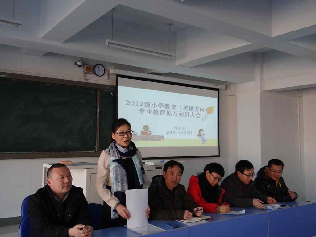 2013年12月9日上午9时,外语系在618教室举行了2012级小学教育(英语方向)专业教育见习动员大会。大会由外语系英语教研室负责人红霞主持,系领导苏日嘎拉图副主任、团总支书记包仓、见习指导教师王牧兰、胡日查、葛木仁及2012级小学教育(英语方向)专业一、二班全体学生参加。大会伊始,苏日嘎拉图副主任作动员报告,明确了教育见习的意义、重要性,并对见习生提出认真对待教育见习的每一个环节,圆满完成教育见习任务的殷切希望。随后,见习指导教师胡日查宣读了《外语系2012级小学教育(英语方向)专业第三学期见习方案》,明确了教育见习目的和任务、教育见习内容、教育见习形式及对指导教师、见习生的具体要求。最后,见习指导教师王牧兰结合专业特点,对如何通过见习提高个人职业技能向全体见习生提出了几点建议。