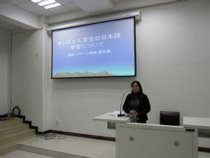 为了提高日语专业师生专业水平,活跃学术交流,2013年11月6日下午4:30—6:00,外语系邀请蒙古国国立大学蒙古语言文化学院外语系Erdenesan Togtuun教授在教学楼106教室为日语专业师生做了题为《蒙古语授课学生日语学习策略》的学术讲座。日语专业教师及日语专业蒙古语授课班学生100多人收听了讲座。