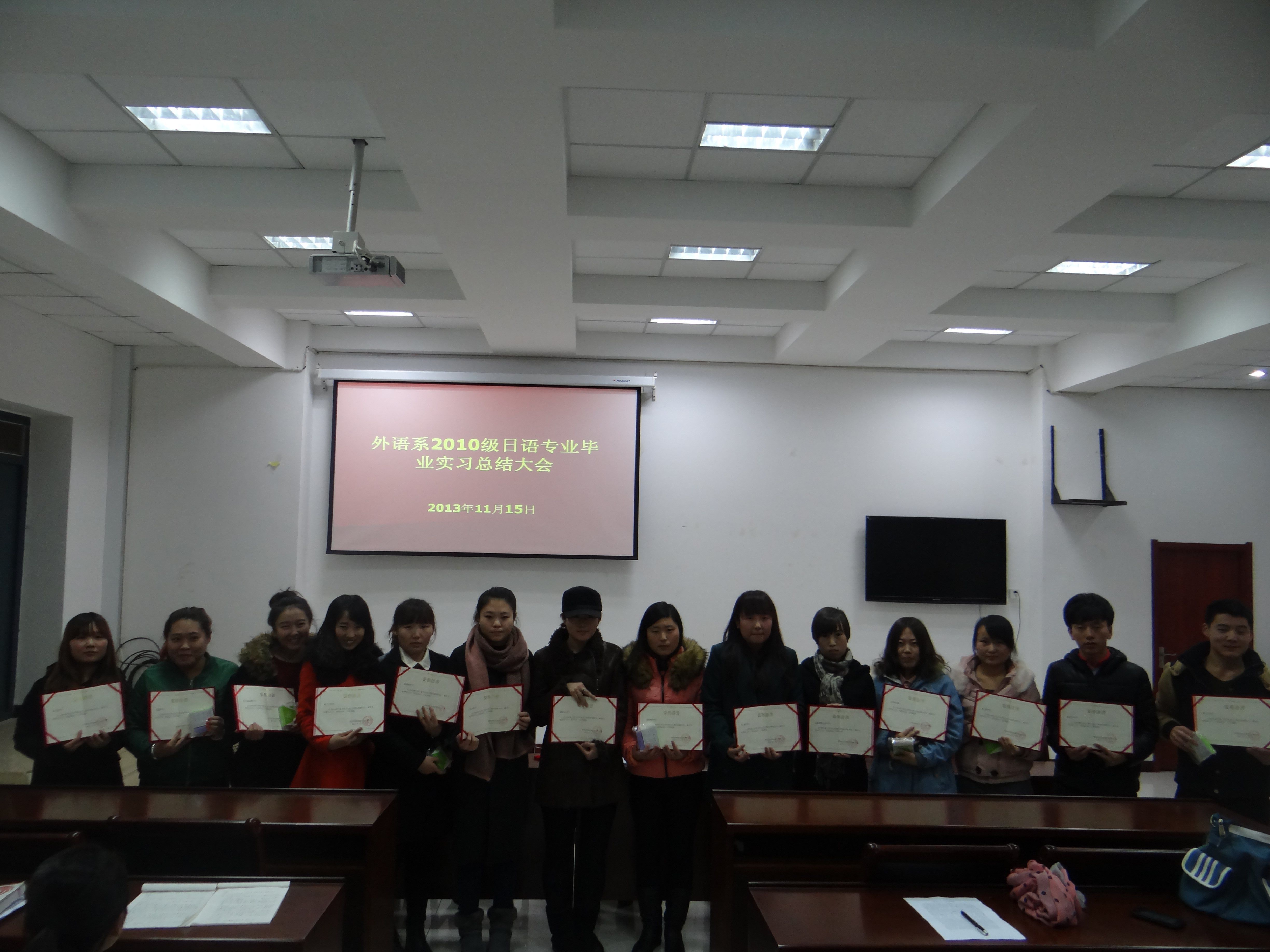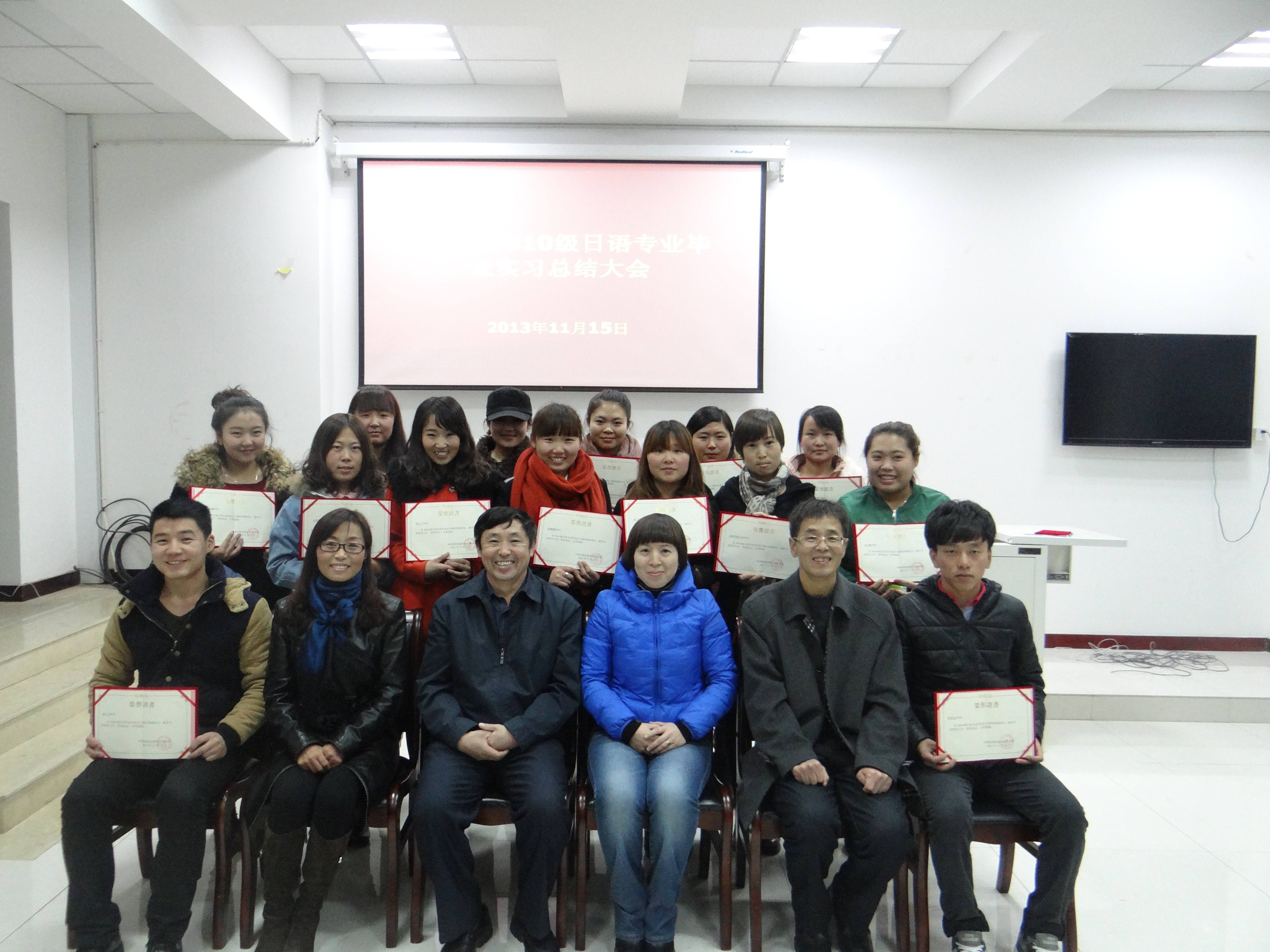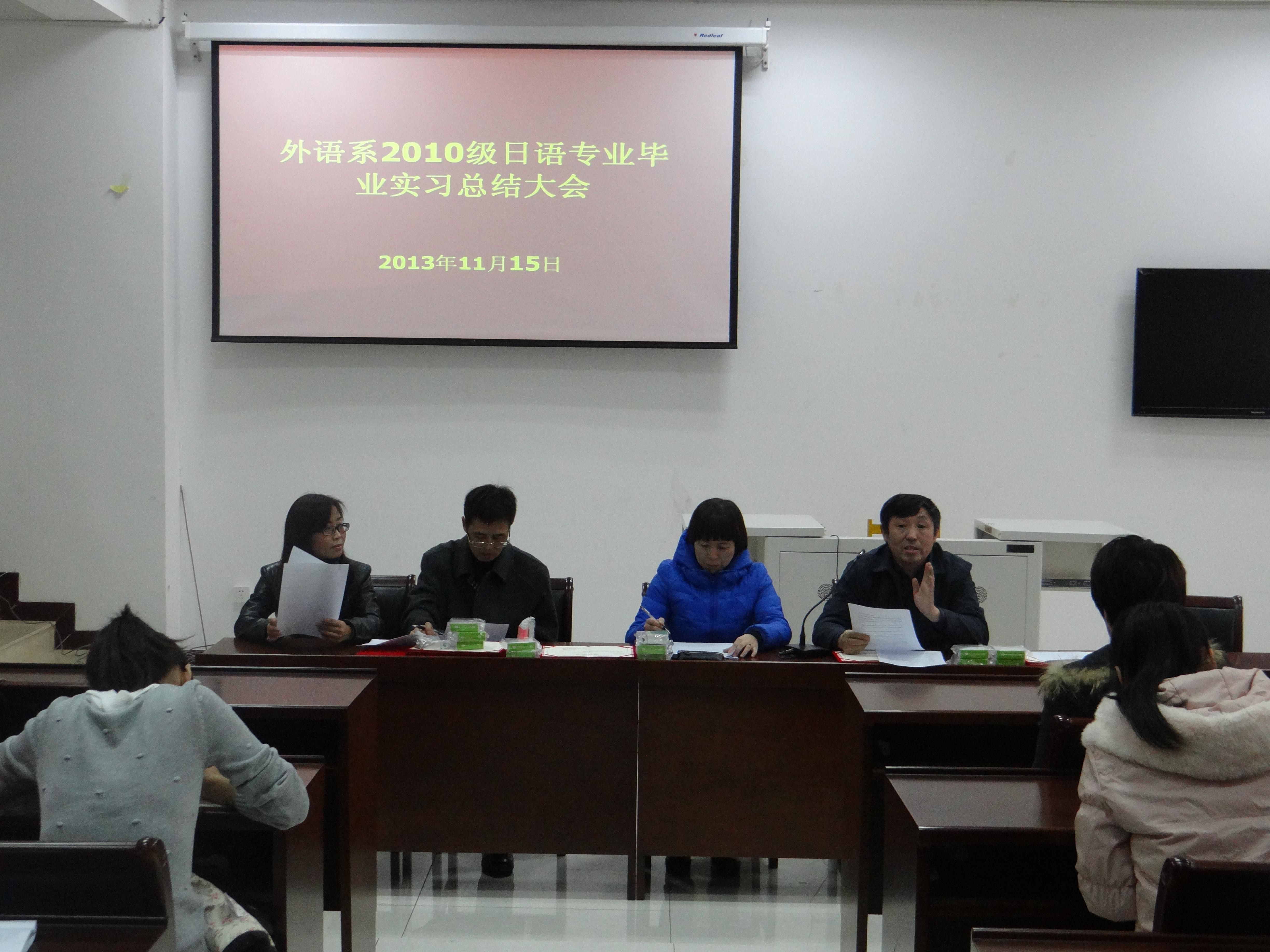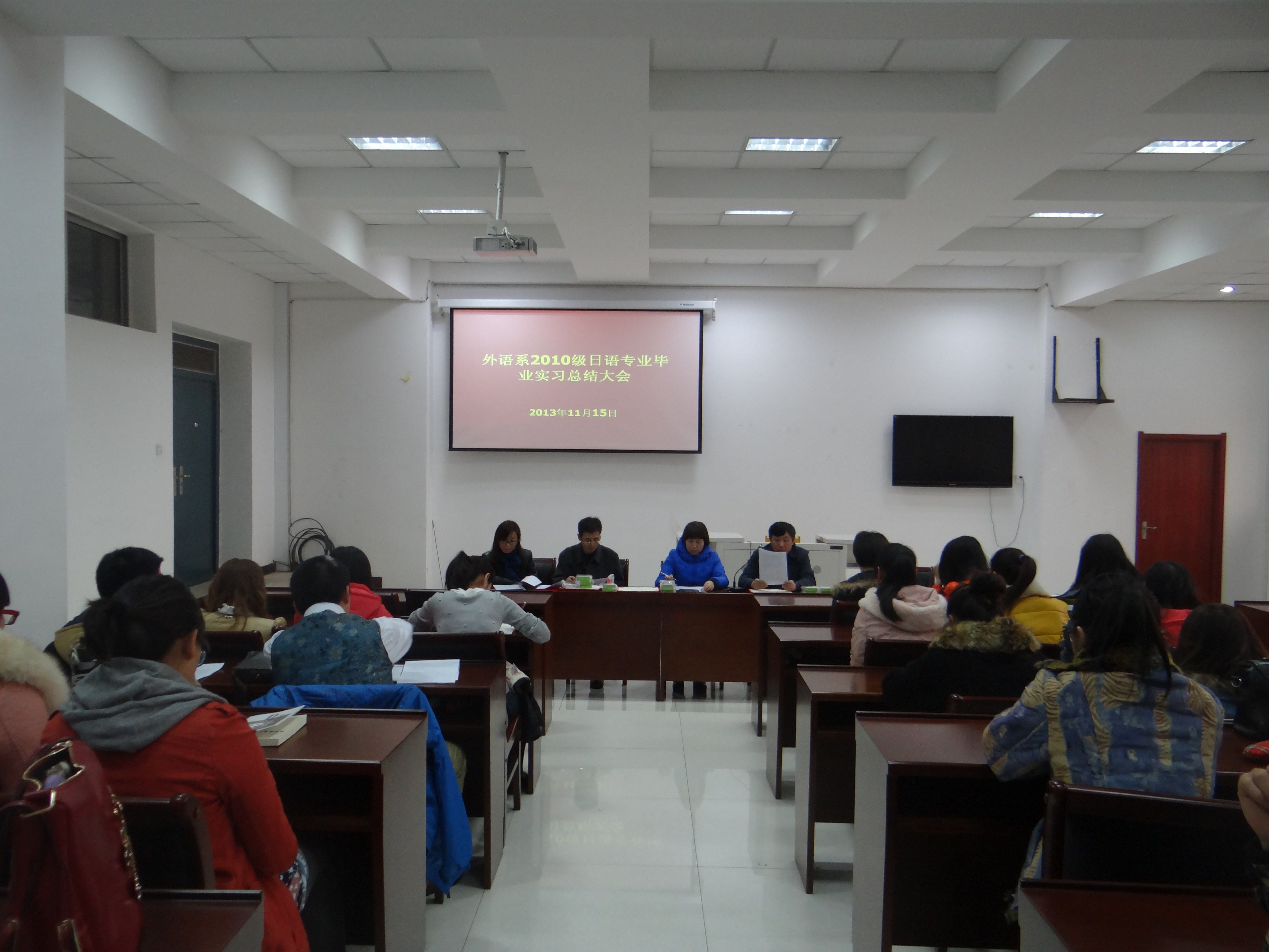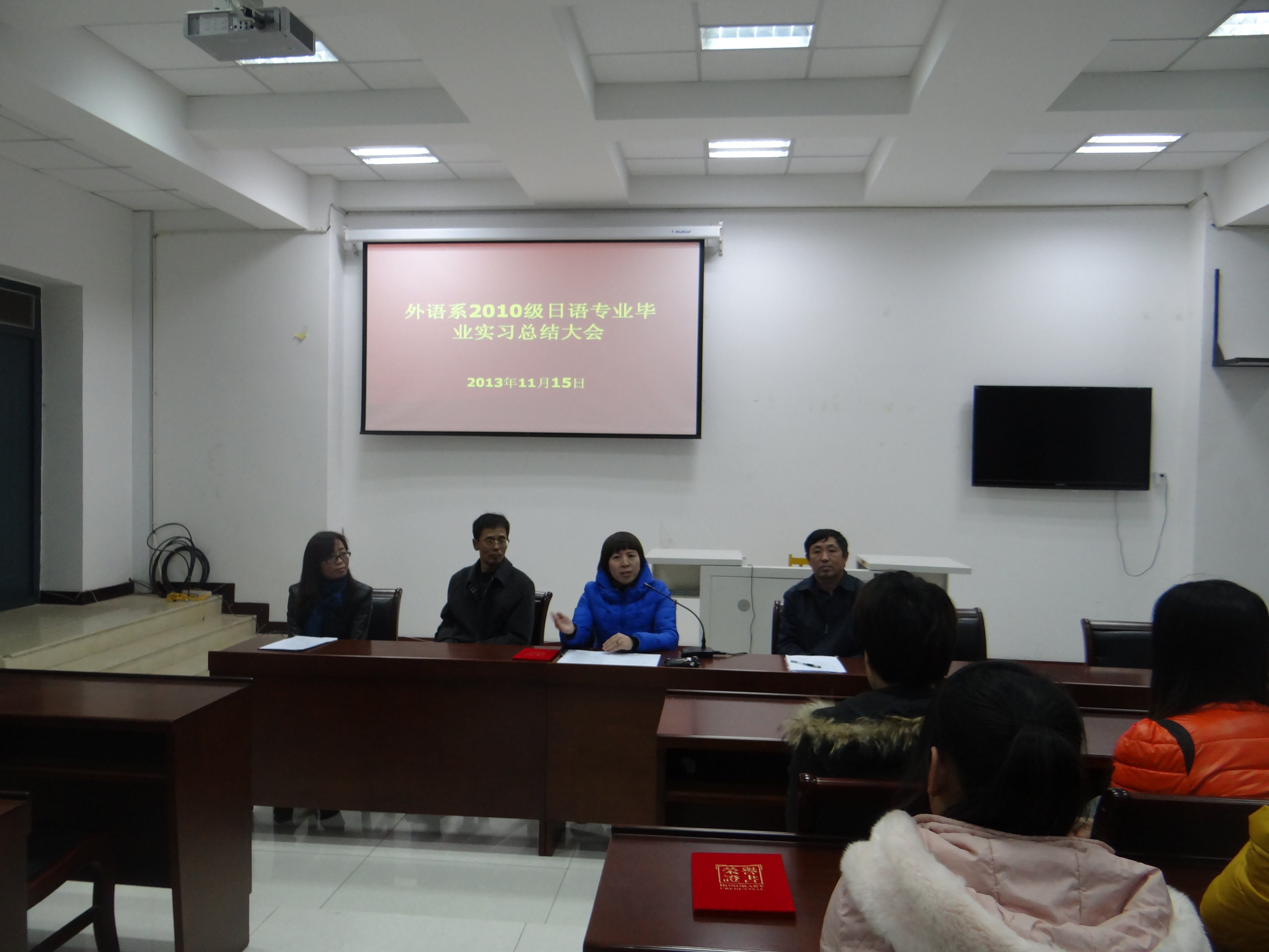 2013年11月15日下午,外语系于教学楼106教室召开了2010级日语专业实习总结大会。外语系肖查娜主任、日语教研室马福山主任、实习指导教师及2010级日语专业全体学生出席会议。