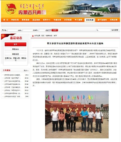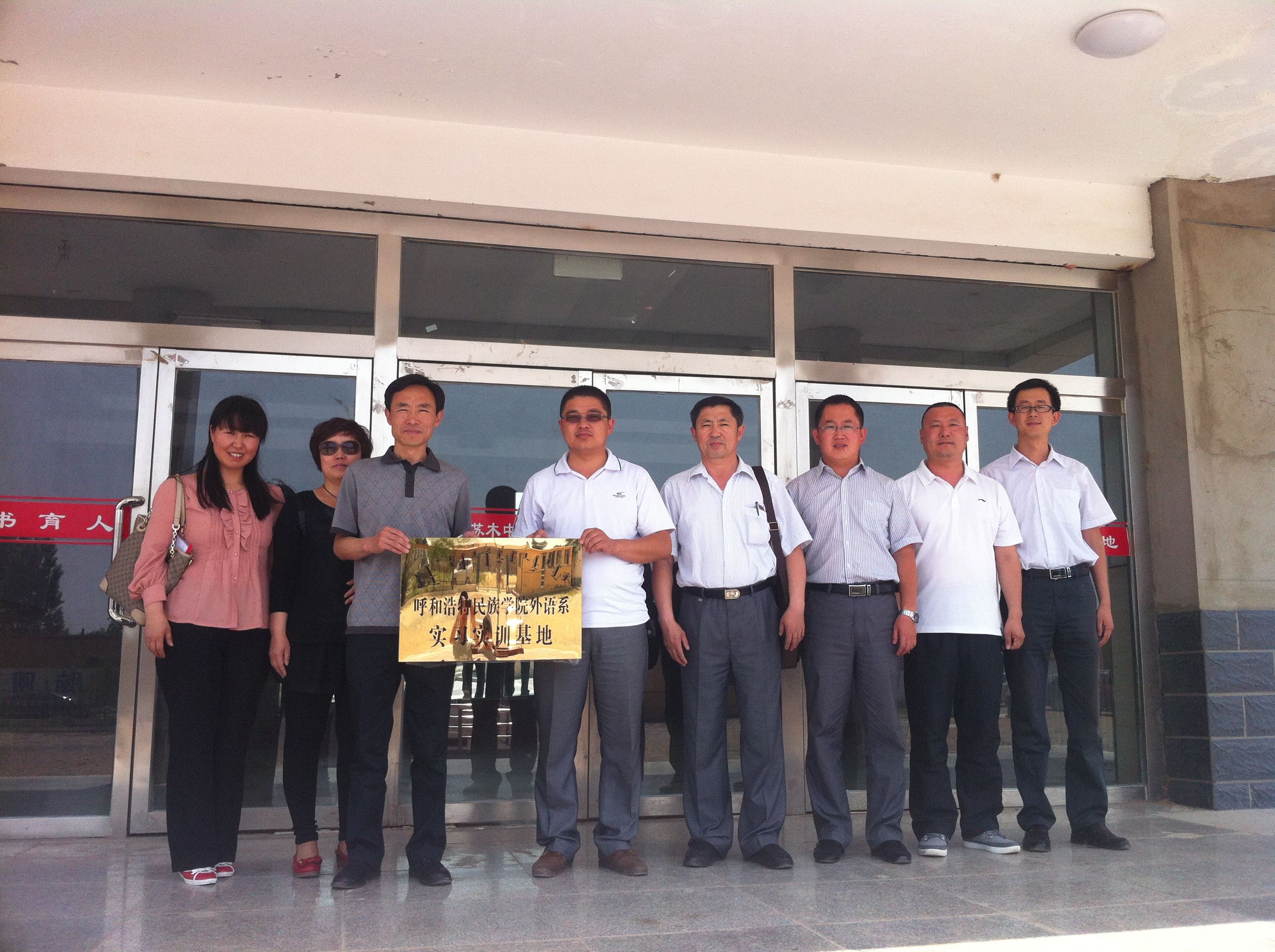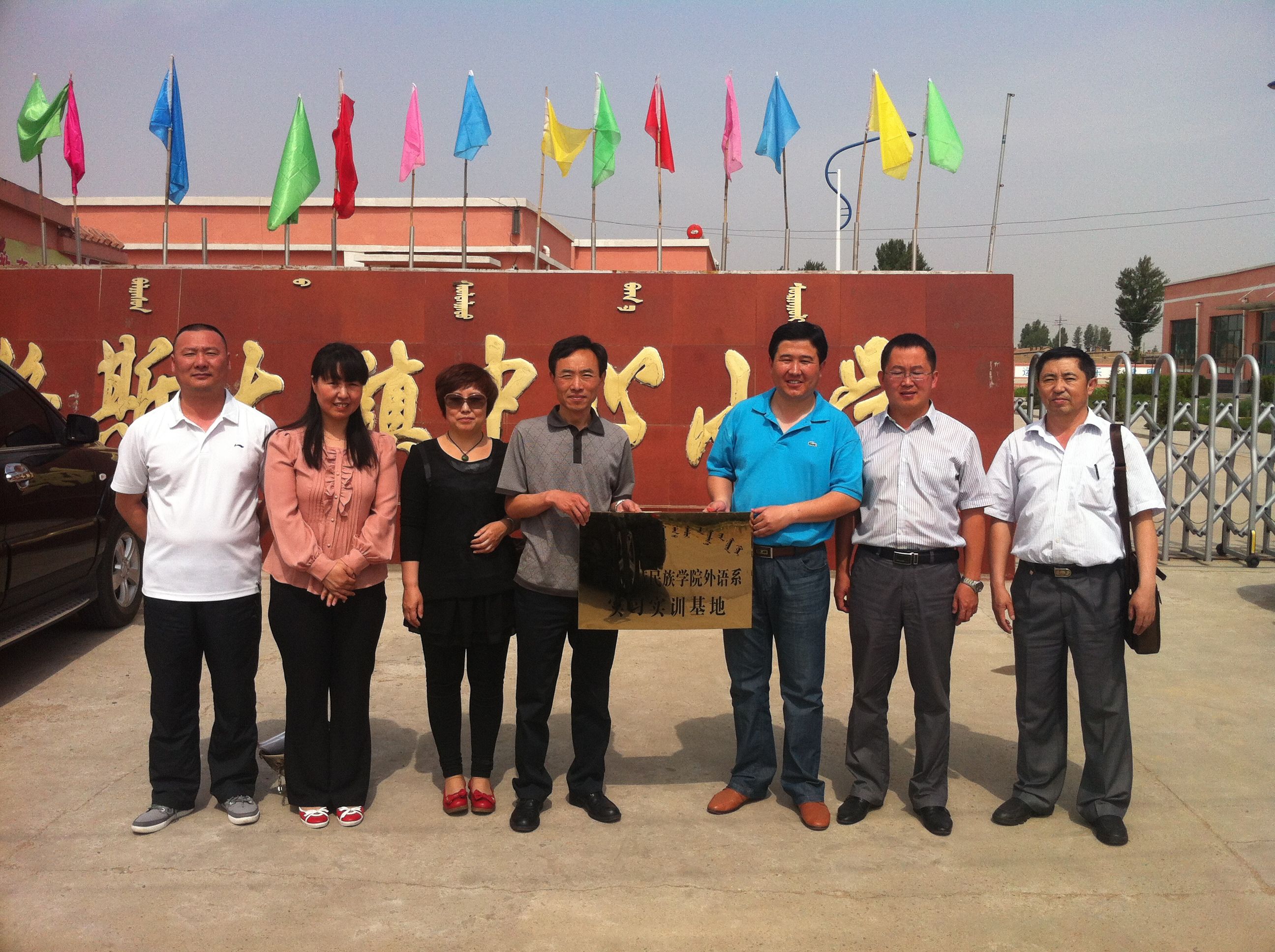 为拓展外语系校外实习、实训基地及社会实践基地,经过一个月的筹备,2013年6月5日,外语系副主任苏日嘎拉图、团总支书记包仓、日语教研室主任马福山、英语教研室副主任乌云斯日古楞、英语教研室副教授萨仁格日乐一行5人赴鄂尔多斯市达拉特旗王爱召镇中心小学、达拉特旗展旦召苏木中心小学、达拉特旗吉格斯太镇中心小学、鄂尔多斯市恩格贝生态示范区管理委员会(附属5个二级单位)等四家单位签订了校外实习、实训基地及社会实践基地合作协议并举行了挂牌仪式。出席本次挂牌仪式的当地领导有:达拉特旗团委书记白晓燕、达拉特旗团委副书记李丙楠、达拉特旗团委青农工部部长祁斌,以及各签约单位领导。