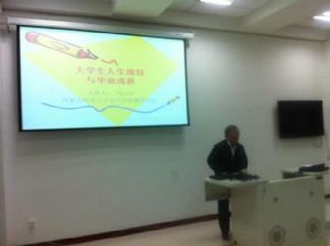 2013年9月28日晚7:30,外语系公共外语教研室教师及部分一年级、三年级学生在新教学楼106教室聆听了内蒙古外语教学研究会会长、内蒙古师范大学马占祥教授的精彩讲座。马占祥教授以“大学生人生规划与毕业选择”为题,就英语专业大学生如何进行生活规划、就业前职业规划及考研和就业的利弊等问题进行了深入的阐释。马老师以一句西方谚语“If you do not know where you want to go, then usually you can not go anywhere ...”引导同学们认识规划和定义的重要性。用生动的故事、现实的例子、多年的经验教给大家“定位决定人生,规划改变人生”的深刻道理。讲座结束后,同学们就感兴趣的话题积极提问,马占祥教授耐心、细致地解答了同学们的问题。