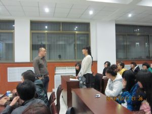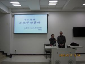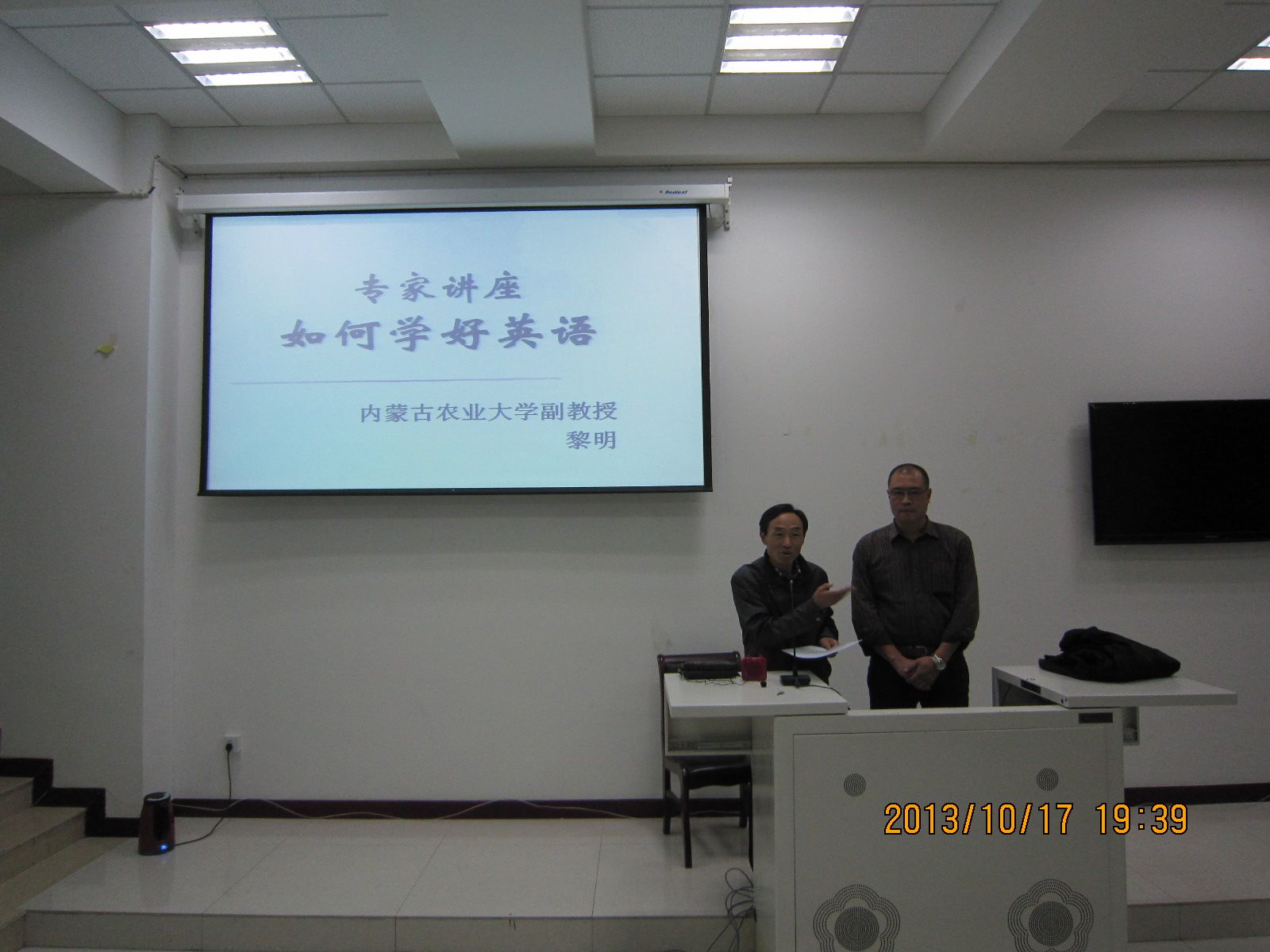 2013年10月17日晚7:30,外语系英语教研室教师及2013级本科班、2012级本科班学生在新教学楼106教室听取了内蒙古农业大学黎明副教授的精彩讲座。黎明副教授以《如何学好英语》为题,结合自身英语学习及留学经历,就英语专业学生如何学好英语、英语最新学习方法、英语专业的发展趋势等问题进行了深入详细的讲解。期间,师生们还与黎明副教授随行的两位得意弟子进行现场互动,交流学习经验。讲座结束之后,同学们就感兴趣的话题积极提问,黎明副教授一行做了耐心细致的解答。此次讲座贴近学生学习实际,极大地激发了学生的学习热情,坚定了他们学好专业的信心。